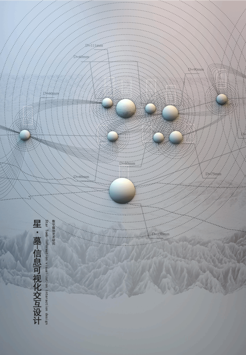 作品说明:《星·墓》是一场独特的艺术展览,将信息化设计和交互技术融合,以唐十八陵为主题,将帝王陵墓比作闪耀的星辰。展览通过数据可视化和交互技术展示人们对这些珍贵历史遗产的关注和影响。观众可以双手操控设备,探索星空中的陵墓和星光。陵墓发散不同数量的星光,根据在网络搜索指数中的排名确定。观众的互动行为将影响星光的运动轨迹和位置。《星·墓》旨在唤起观众对鲜为人知历史文化遗产的关注。通过信息化设计和交互技术的结合,展示人们的主观能动性如何为这些珍贵的历史遗产带来关注和影响。展览希望让观众在艺术与科技的交融中重新发现和认识这些历史的瑰宝及其对文化传承的重要性。