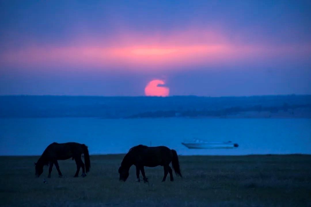 作品简介:2023年5月13日,陕西省榆林市神木市红碱淖,夕阳中的湖畔上,马儿在悠然自得地吃草。