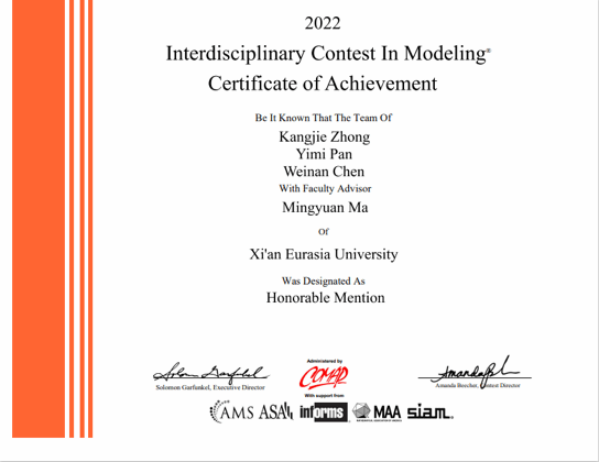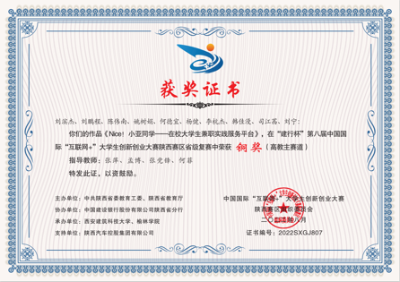 功夫不负有心人,陈伟南在专业上付出的努力都得到了可喜的收获。他所参与的项目先后获得了第八届中国国际“互联网+”大学生创新创业大赛陕西赛区高教主赛道铜奖、2022年“挑战杯”陕西省大学生创业计划竞赛铜奖等多个荣誉,并在2022年美国大学生数学建模竞赛中夺得了二等奖(Honorable Mention)。