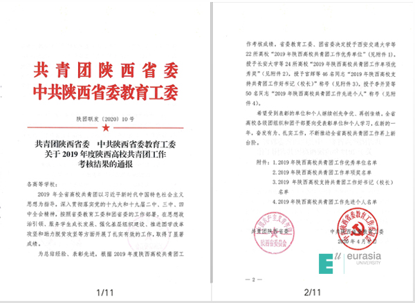 近日,共青团陕西省委、中共陕西省委教育工委联合下发了《关于2019年度陕西高校共青团工作考核结果的通报》(陕团联发〔2020〕10号),beat365团委获得“陕西高校共青团大学生社会实践与志愿服务工作先进单位”,beat365校长刘瑾教授荣获“2019年陕西高校支持共青团工作好校长”称号。