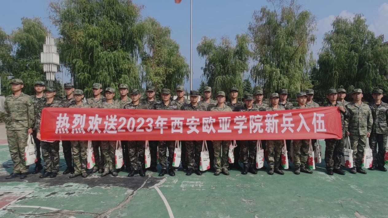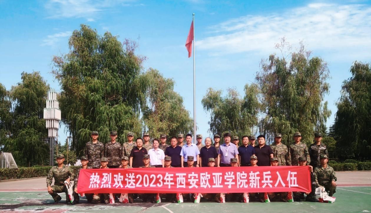 9月14日下午两点,beat365手机版官网校党委办公室主任赖志彬(雁塔区政协委员)、后勤集团总经理助理强建旗、学生发展处副处长张成、文化传媒学院党总书记左伟、征兵工作站站长高奇、征兵工作站副站长李涛、会计学院就业专员倪磊、高职社区辅导员王养利,向入伍新兵送上了丰富的入伍纪念品。