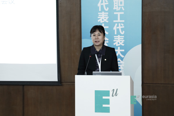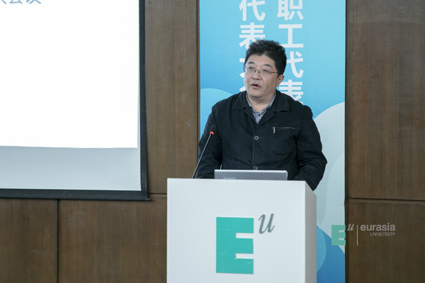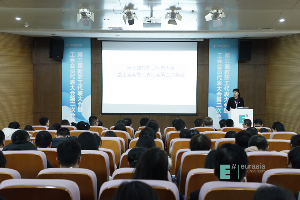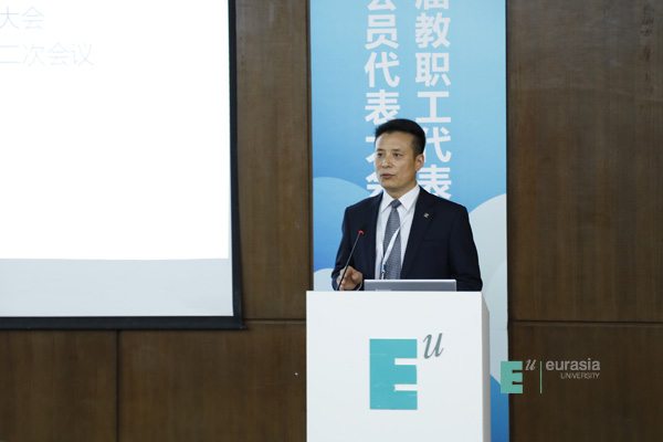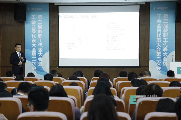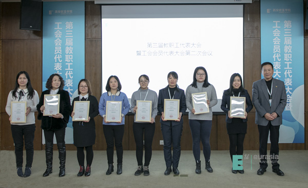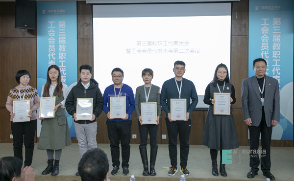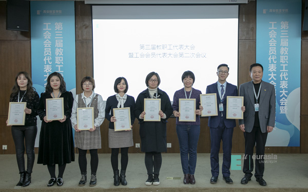 于孟晨书记致闭幕词,他高度肯定了上届工会工作取得的成绩,一是新一届“双代会”作用明显,通过教职工代表建言献策,推动了学校改革发展,维护了教职员工权益;二是校工会“娘家人”成效突出,在教职工子女入学、“欧二代”暑期项目和教职工大健康管理模式创新等方面成效显著;三是教职工文化活动特色鲜明,采取“俱乐部+教职工小家”模式,丰富教职员工文化生活;四是校工会助推发展成效显著,充分发挥工会“参与、维护、建设、教育”作用,有力推动事业发展,为学校赢得声誉。学校被陕西省总工会授予“全省厂务公开职代会五星级单位”荣誉称号。围绕“四个全面”战略布局,全力推进扶贫攻坚,学校再次获得省委教育工委、省教育厅授予的2018年度“双百工程”先进单位。希望本届工会在上级工会和学校党委的领导下,围绕学校新的十年发展战略,团结、引导全体教职工做出新的贡献。