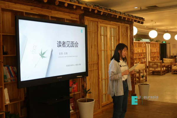 优秀读者周珂讲述她与图书之间的故事。她说“她是一名小学教育专业的学生,特别热爱阅读,平常喜欢历史、文学、教育、心理、社会科学等方面的书籍,正是图书馆给她创造了良好的学习环境和条件,以其丰富的馆藏文献和网络信息技术为她构筑了综合的知识结构。作为一名欧亚读者,她喜欢我们的图书馆,更喜欢图书馆的书籍。每一本书都是一个用黑字印在白纸上的灵魂,只要我们的眼睛,我们的理智接触了它,它就活起来了。通过对每一个灵魂的解读,会让她更具力量”。来自各个学院的读者,在会上畅所欲言,分享了在读书方面的体验,并就专业图书购置、读者服务等方面提出了宝贵的意见。图书馆负责人在现场作了耐心的解答。