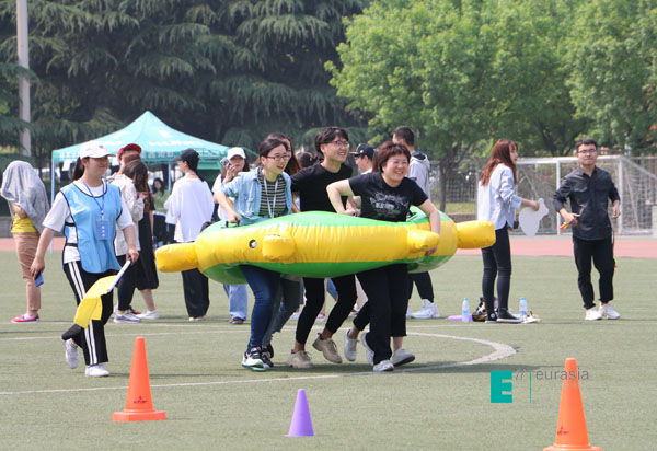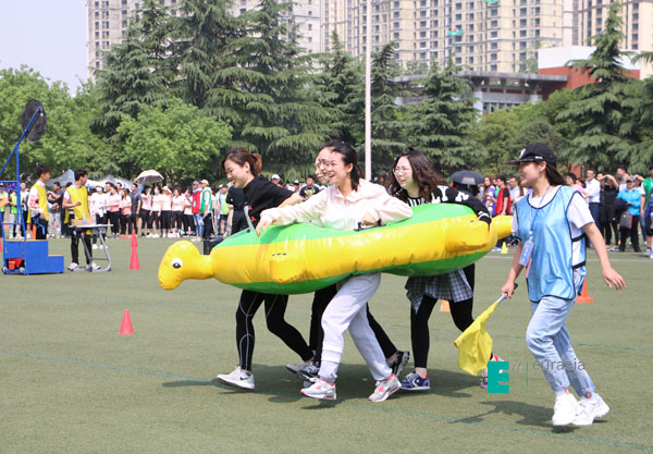 教职工龟兔赛跑趣味项目,参与人数为250余人,10人一组,大家集体协作,相互配合和鼓励,统统完成比赛,比赛过程,欢声笑语不断,该活动让大家体会到了团队协作的魅力和欢乐。