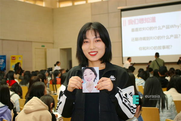 RIO强爽品牌负责人武玥女士不仅对已有产品进行了介绍,还与大家分享了RIO正在研制的其他口味。回答问题的同学们不仅可以得到新口味的RIO鸡尾酒,更有幸运者获得了周冬雨的亲笔签名照。同学们都积极踊跃地举手回答问题,现场气氛瞬间被推向高潮。