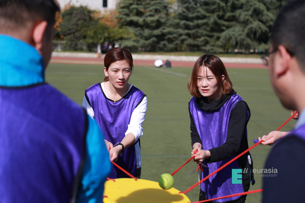 第五关:鼓动人心。大家迸住呼吸、轻轻拽动绳索,只求在那一刻“同心同德”,控制好那个小小的球,让它乖乖地在鼓上连续跳跃10下。鼓的一上一下,都牵动着大家的眼和心。这一刻,我们紧密在一起!