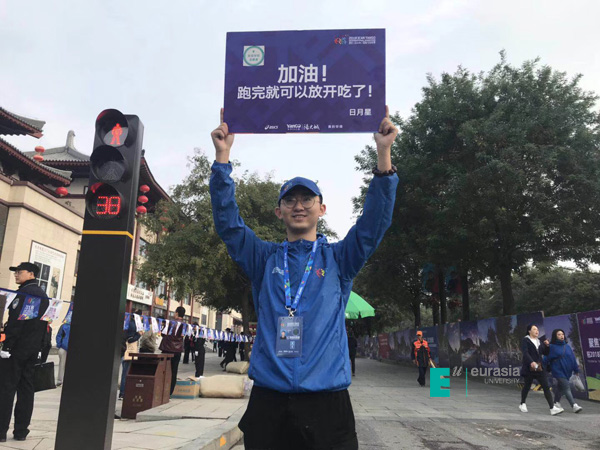 比赛当天,大部分人还在睡梦中时,我们的志愿者们却于凌晨4:30已整装待发。带上工作证,贴上欧亚志愿者的标志,踏上征途,他们到的比选手早,走的比选手晚,他们强忍着寒风的刺骨,也没有轻易放下举在手中的标语。因为他们知道,每一个从身旁经过他的选手都有可能会看一下他们手里的标语。