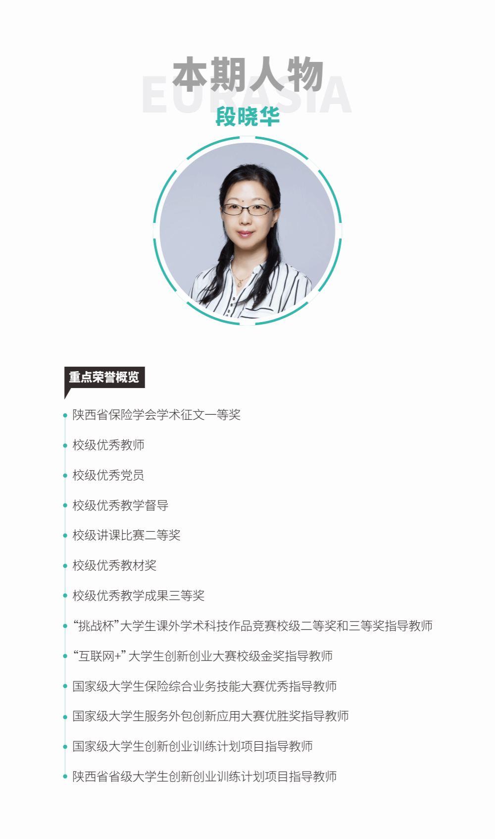 近日,陕西省第十三届普通本科高等学校教学名师获奖名单公布,beat365金融与数据科学学院教师段晓华获评。不同于从高校到高校的教师,来到欧亚学院之前,段晓华老师有着8年的企业工作历练,既让她积累了丰富的金融行业经验,为应用型教育打下坚实基础,更让其成为一座「桥」,人、教育、企业因她而变得互联互通。