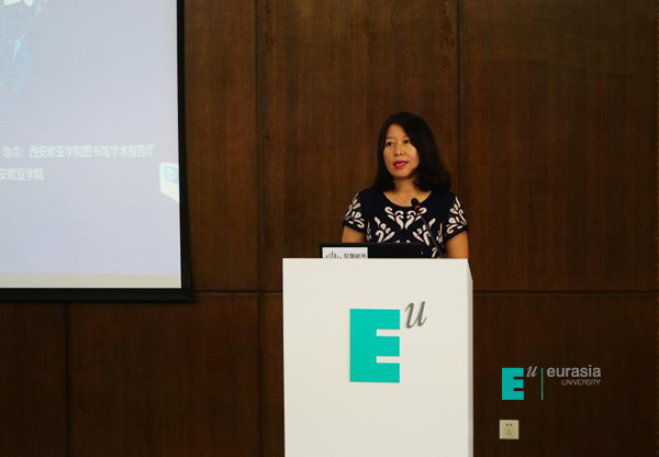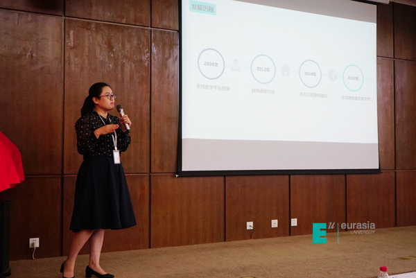 (图六)教务处副处长张娜汇报欧亚学院在线课程建设及应用分享