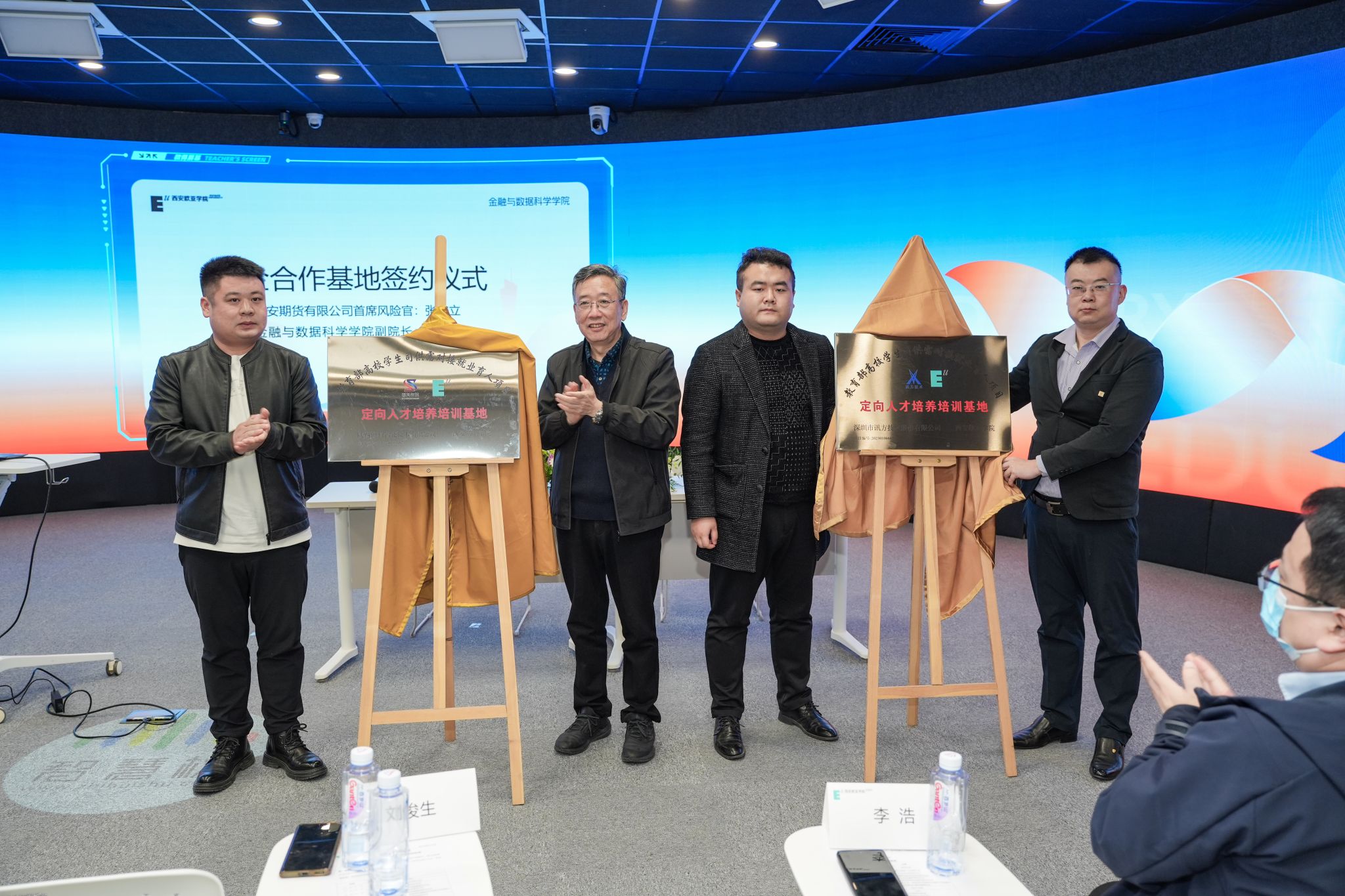 (图六)深圳讯方技术股份有限公司经理刘俊生、陕西硕科智能技术有限公司经理李浩和金融与数据科学学院学术院长王满仓、副院长姜恺共同进行定向人才培养培训基地揭牌仪式。