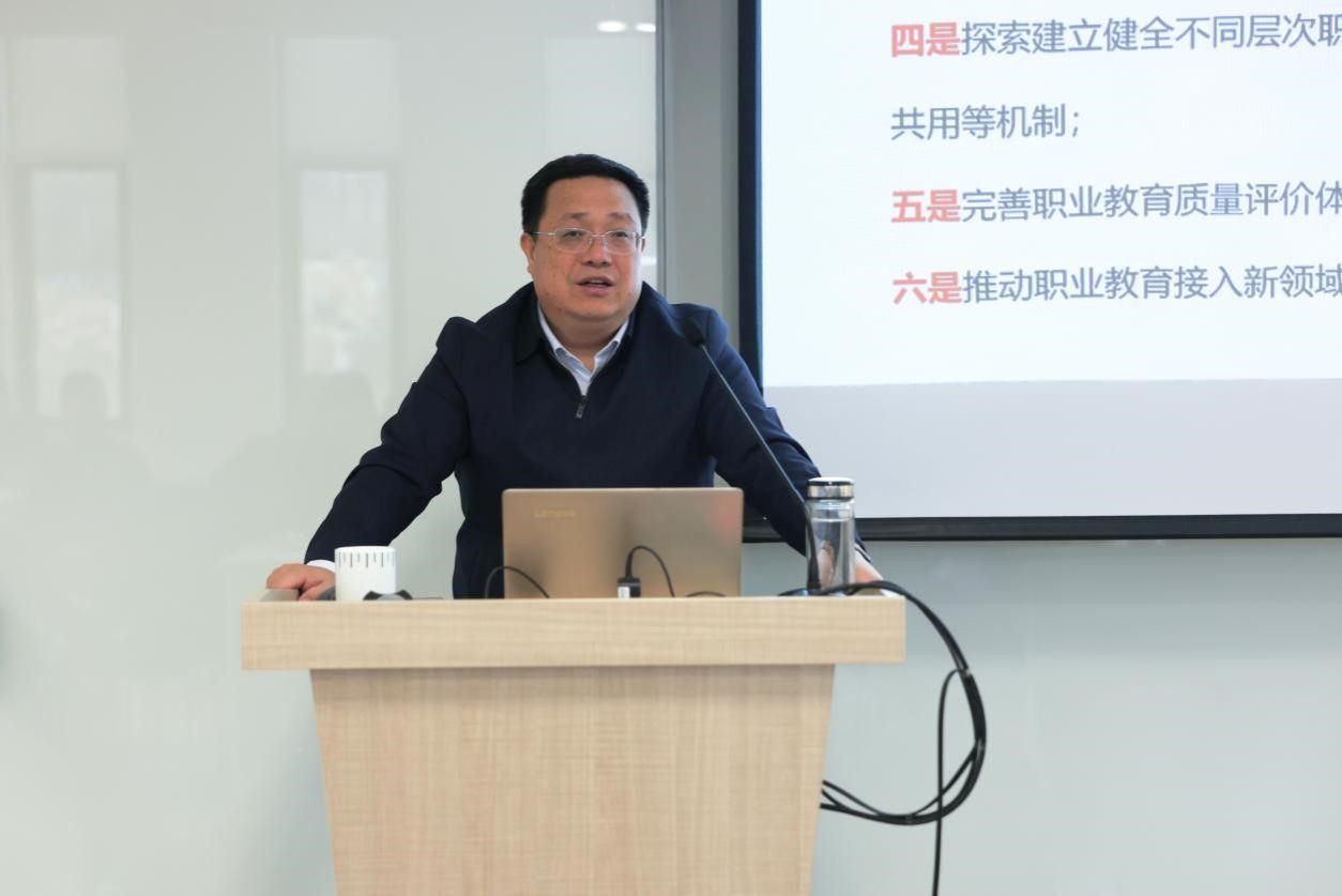 陕西省政协副主席,省中华职业教育社主任李忠民为学员们带来《努力做好新时代职业教育》的主题辅导。他指出:“三教”协同是新时代我国人力资源深度开发的必由之路。“三融”发展是职业教育促进教育强国、科技强国、人才强国建设的必由之路。立足陕西实际,发挥自身优势,明确主攻方向,主动融入和服务构建新发展格局,努力在实现科技自立自强、构建现代化产业体系、促进城乡区域协调发展、扩大高水平对外开放、加强生态环境保护等方面实现新突破,奋力谱写中国式现代化建设的陕西篇章。