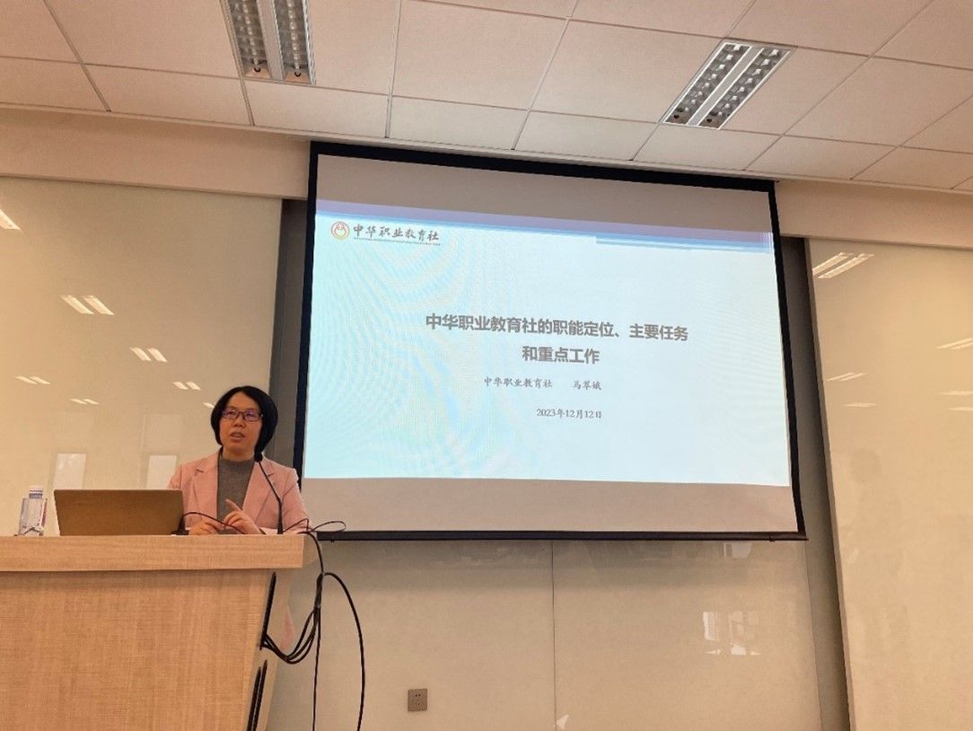 中华职业教育社办公室主任马翠娥以《中华职教社职能定位、主要任务和重点工作》为题做报告。中华职业教育社要处理好的六种关系,即处理好“三性”之间的关系,处理好总社与地方社之间的关系,处理好事发发展中“虚”与“实”之间的关系,处理好自力更生与凝聚资源之间的关系,处理好创新发展与遵规守纪之间的关系,处理好实干与宣传之间的关系。