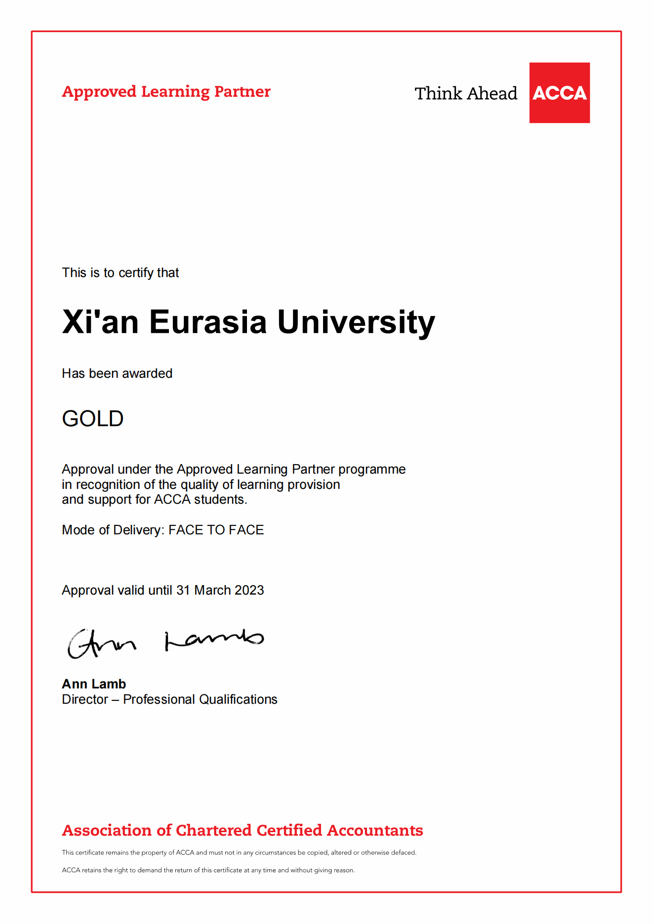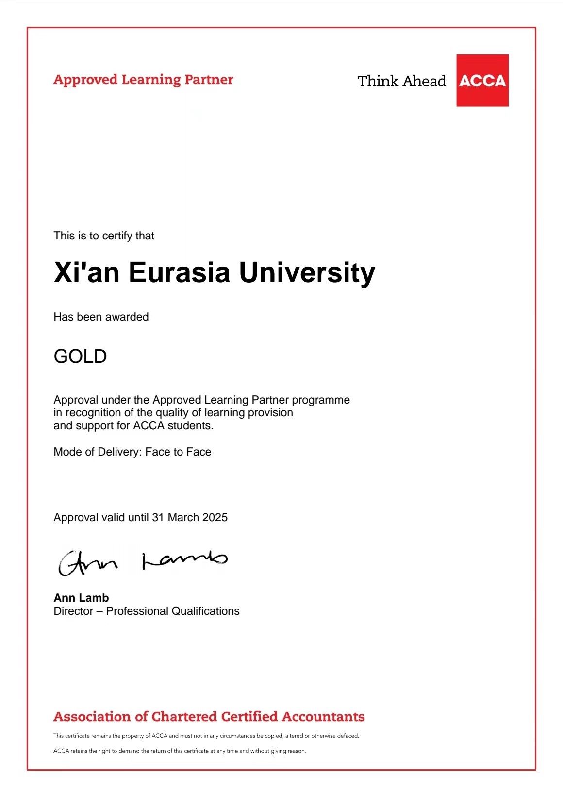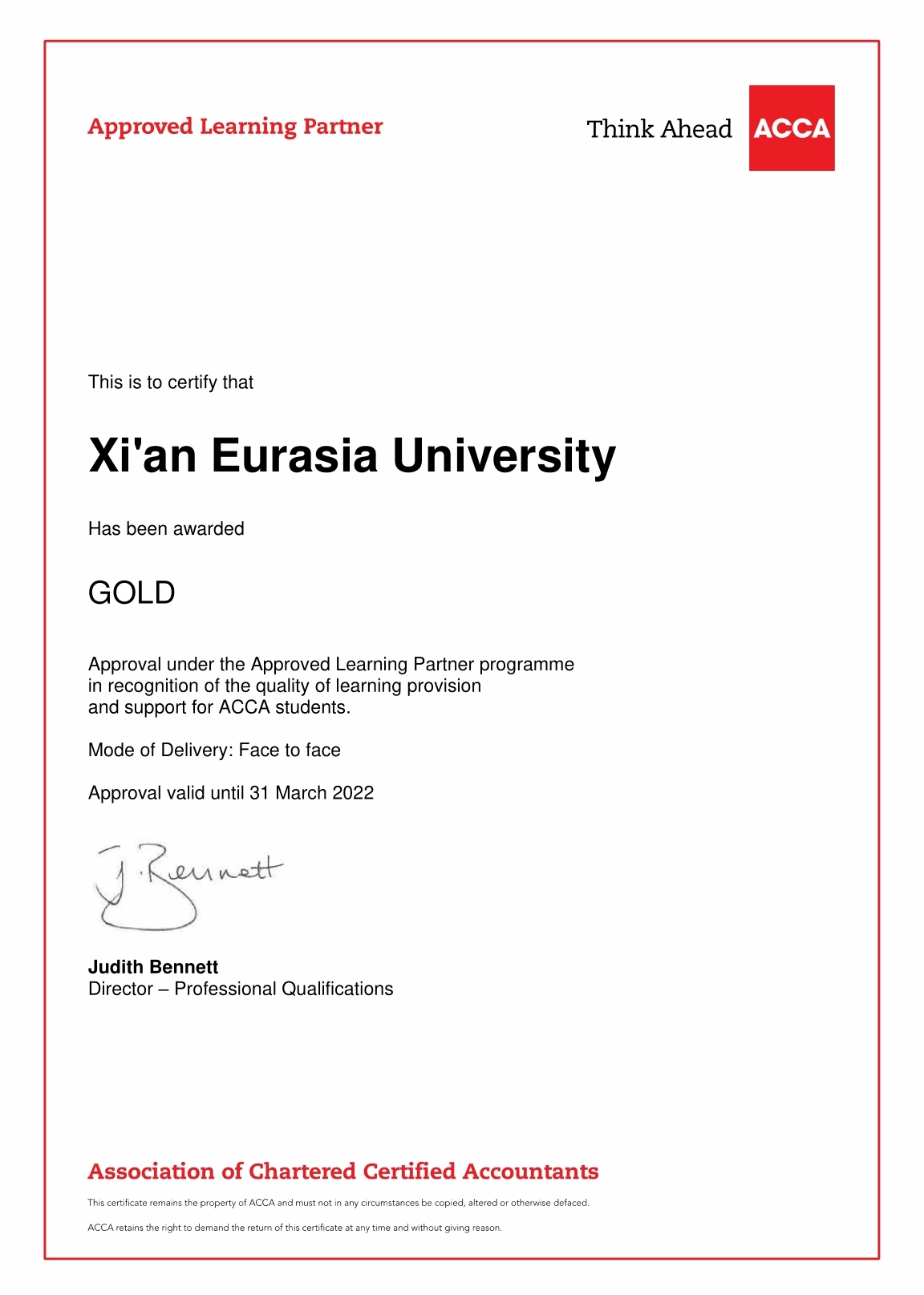 ACCA英国总部每年都会对“ACCA黄金级教育机构”进行年审。只有达到“ACCA黄金级教育机构”各项考核指标要求,审核通过年审才能继续保持“ACCA黄金级教育机构”的资质。在中国开办ACCA的大学中有7所高校是“ACCA黄金级教育机构”。其中6所是公立一本大学,beat365手机版官网是中国民办大学中唯一的“ACCA黄金级教育机构”。也是中国东北、西北、西南地区所有开办ACCA的高校中唯一的“ACCA黄金级教育机构”。