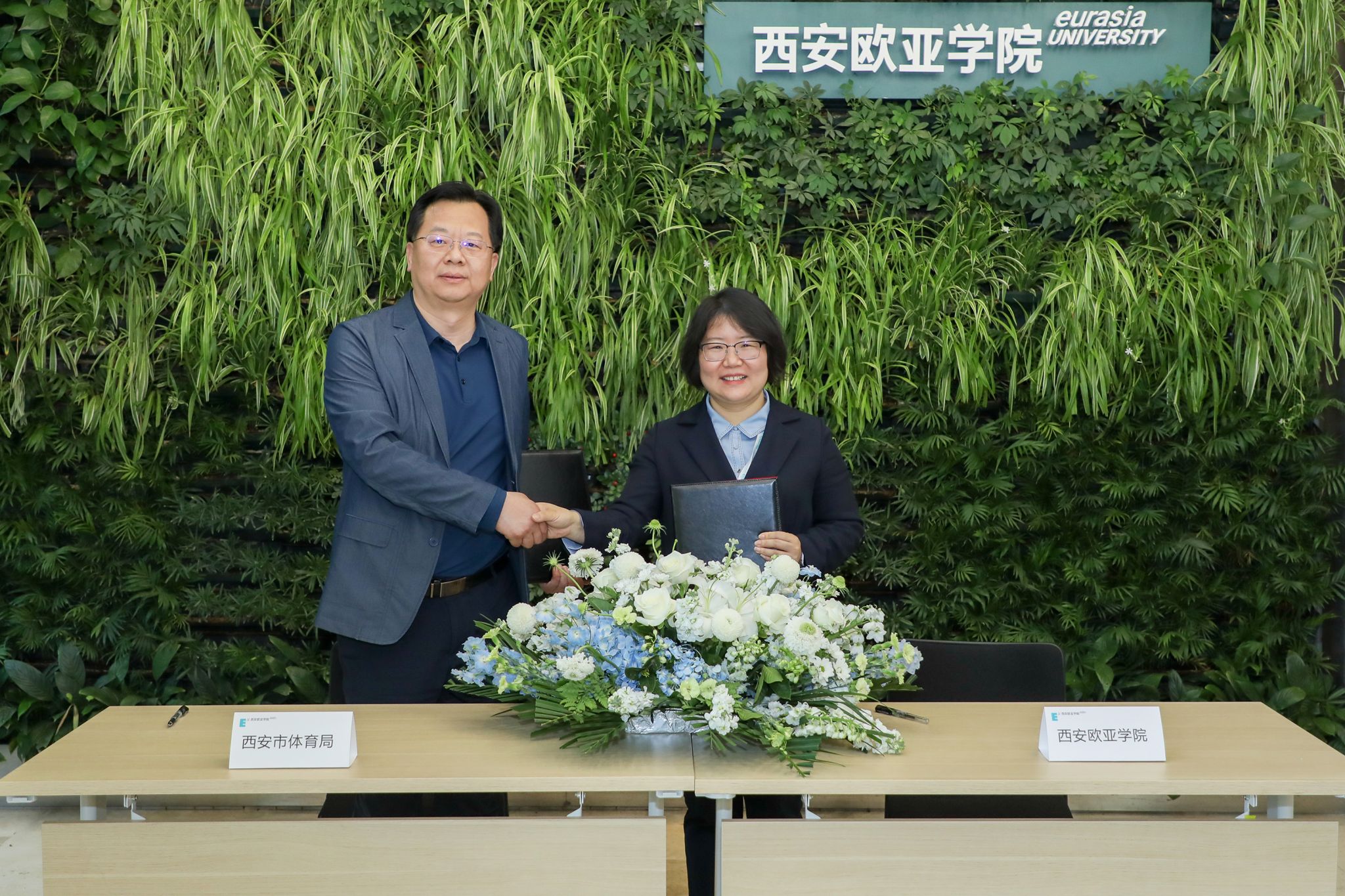 (图一)西安市体育局二级巡视员吴逸伦(左)与beat365手机版官网副校长王艳(右)代表双方签订战略合作协议