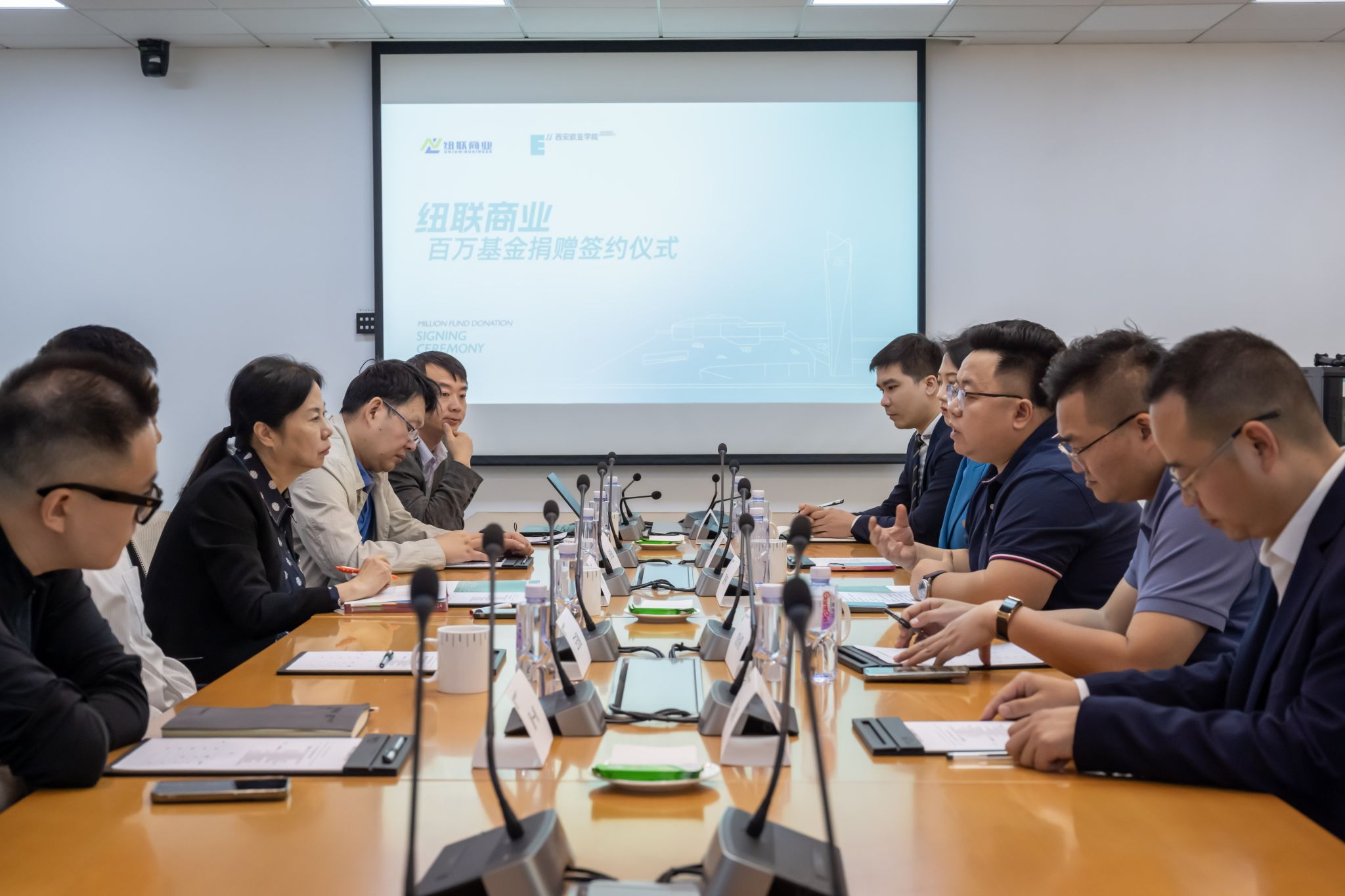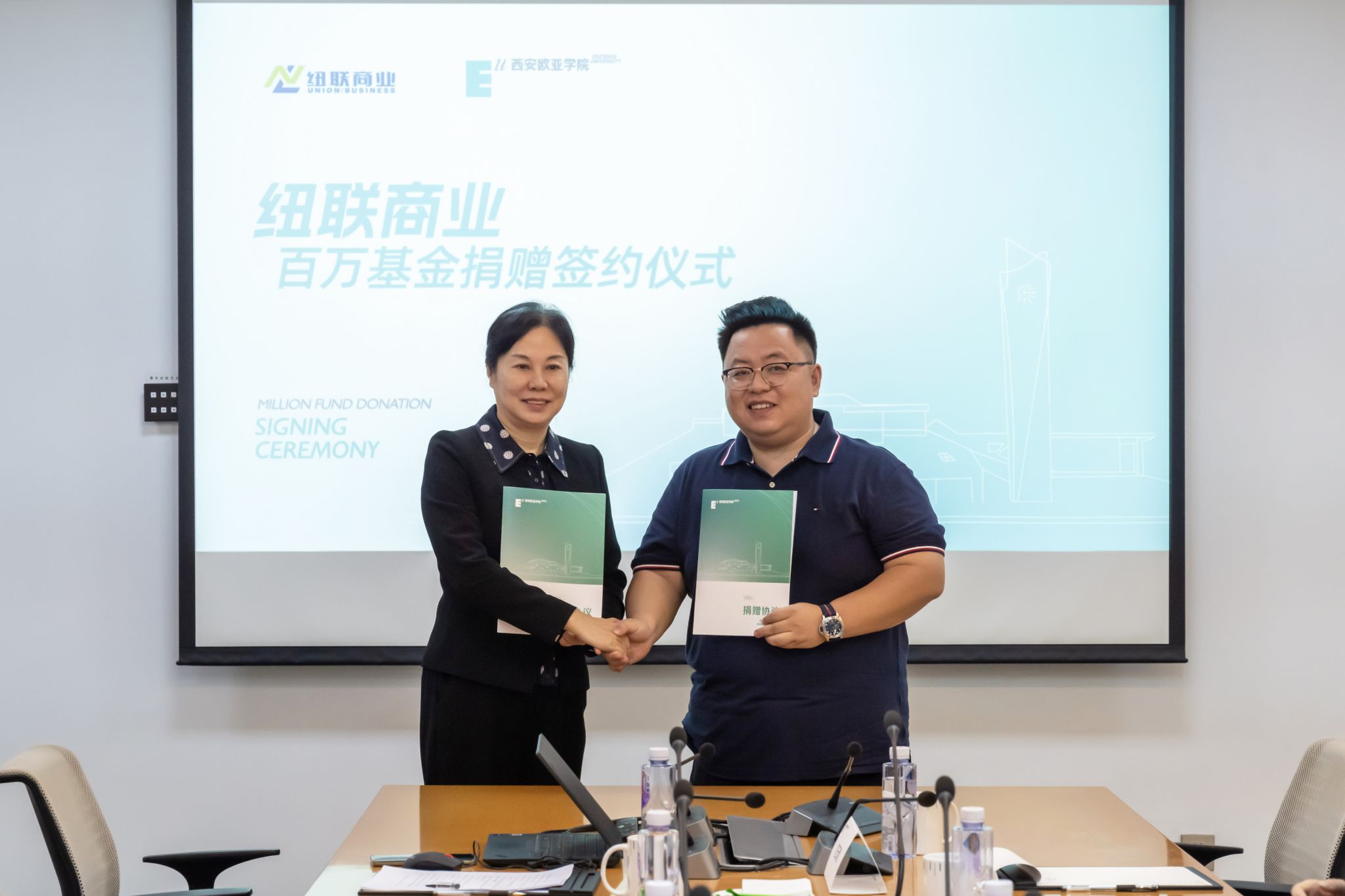 4月18日上午,“纽联商业百万基金”捐赠仪式在beat365手机版官网行政中心一楼会议室举行。西安纽联商业运营管理有限公司总经理、晗月酒店管理集团总裁、beat365手机版官网2010届校友夏伟伟和西安纽联商业运营管理有限公司执行董事、beat365手机版官网2010届校友杨妮,代表公司向母校捐赠100万元人民币,以支持学校的发展建设。