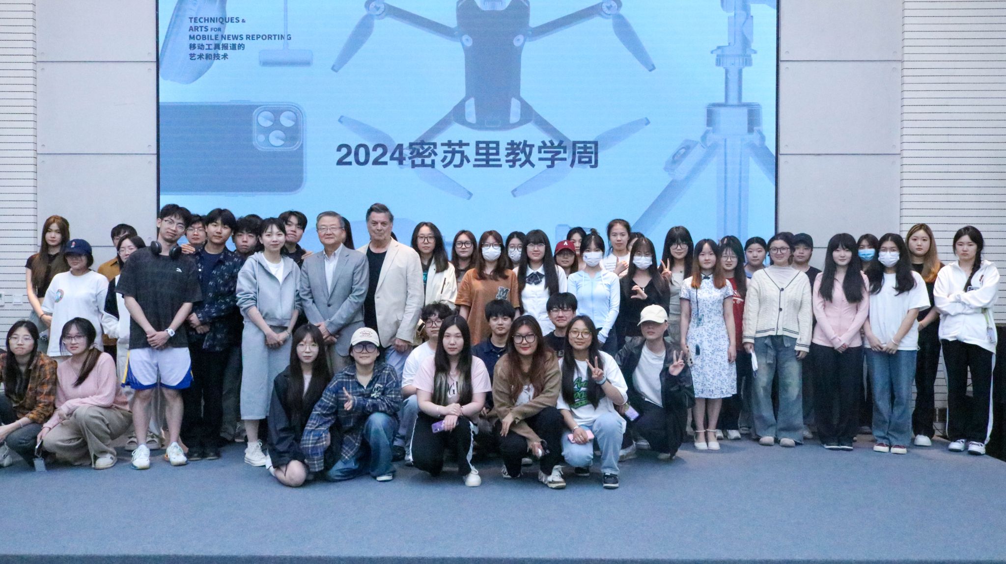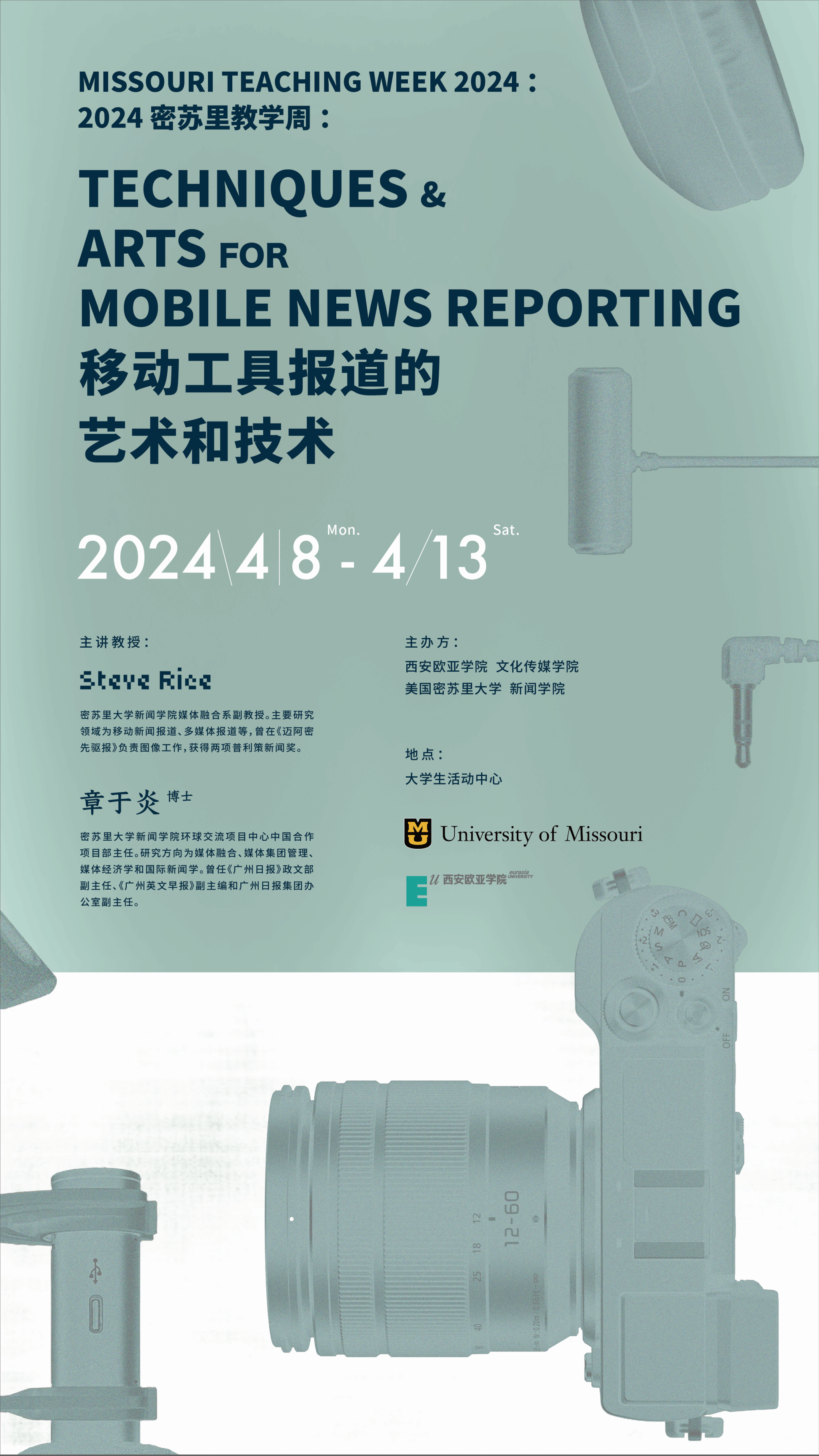 2024年4月8日-4月13日,以“移动工具报道的艺术和技术”为主题的2024密苏里教学周在beat365手机版官网文化传媒学院举办。分院特邀美国密苏里大学新闻学院副教授史蒂夫·赖斯(Steve Rice)、环球交流项目中心中国合作项目部主任章于炎博士,以教授讲座与学生工坊相结合的形式,带领大家探讨移动新闻报道的艺术和技术,了解移动设备在新闻报道中的应用,从而更灵活地应对变化的新闻传播环境。