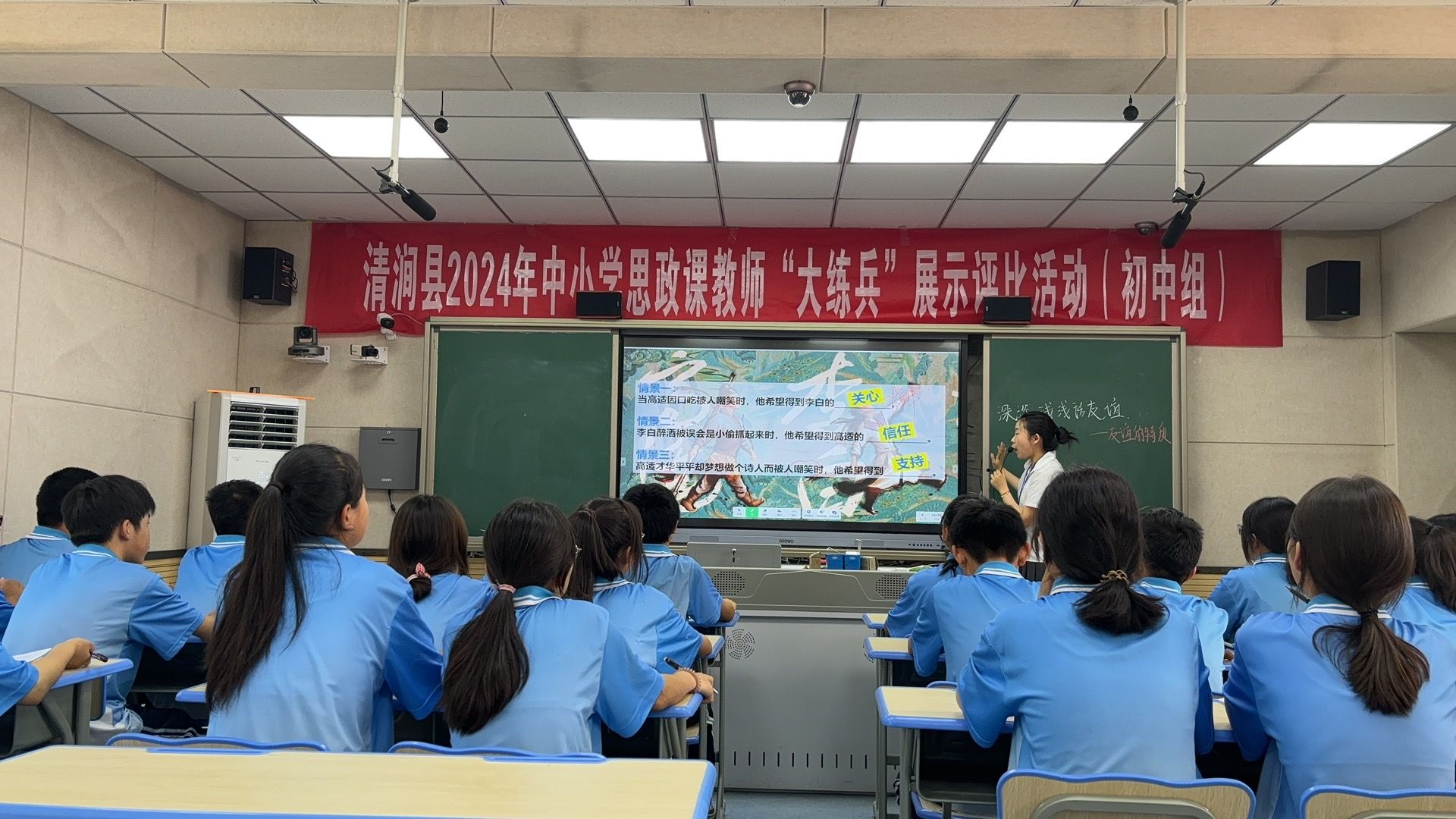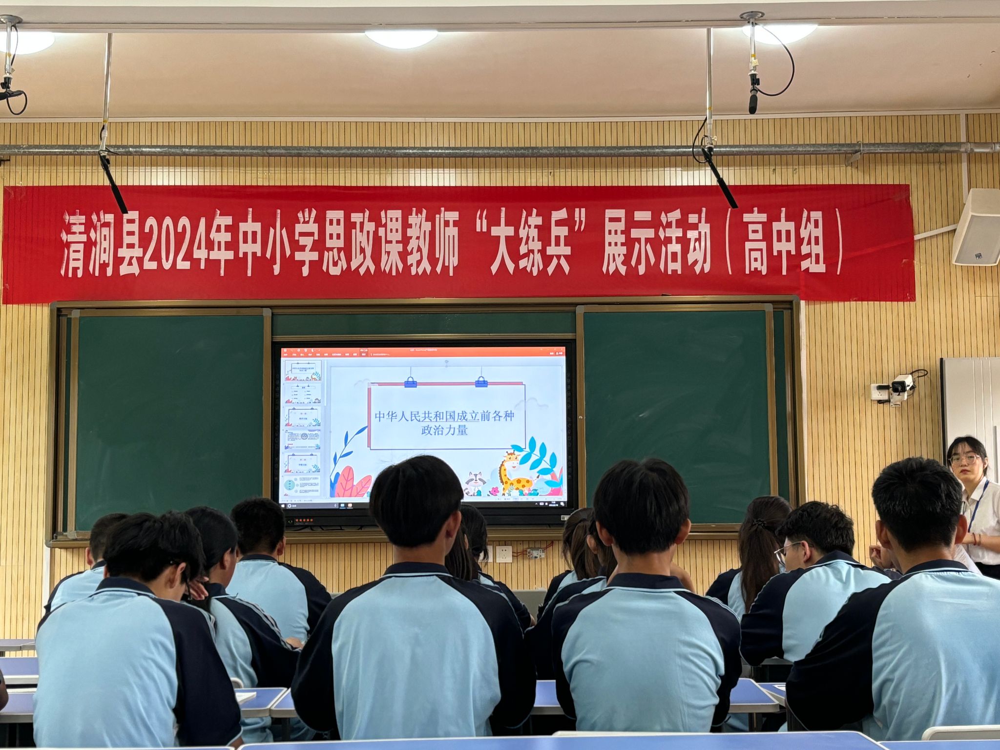 本次思政课教师“大练兵”活动分小学、初中、高中三个专场,于6月17日至18日同时在清涧县昆山中学、清涧中学和清涧县第一小学展开。共有29名清涧县中小学教师参加了现场展示活动,展示交流内容包括单元整体设计、说课与讲课展示、时政述评三部分。马克思主义学院胡方圆、刘应清、项清喜、陈青老师分别应邀担任初中、高中和小学组评委。