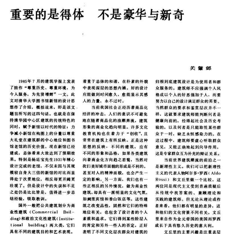 (图七)关先生于1992年在《建筑学报》所发表的《重要的是得体 不是豪华与新奇》一文,至今仍有重要指导意义。