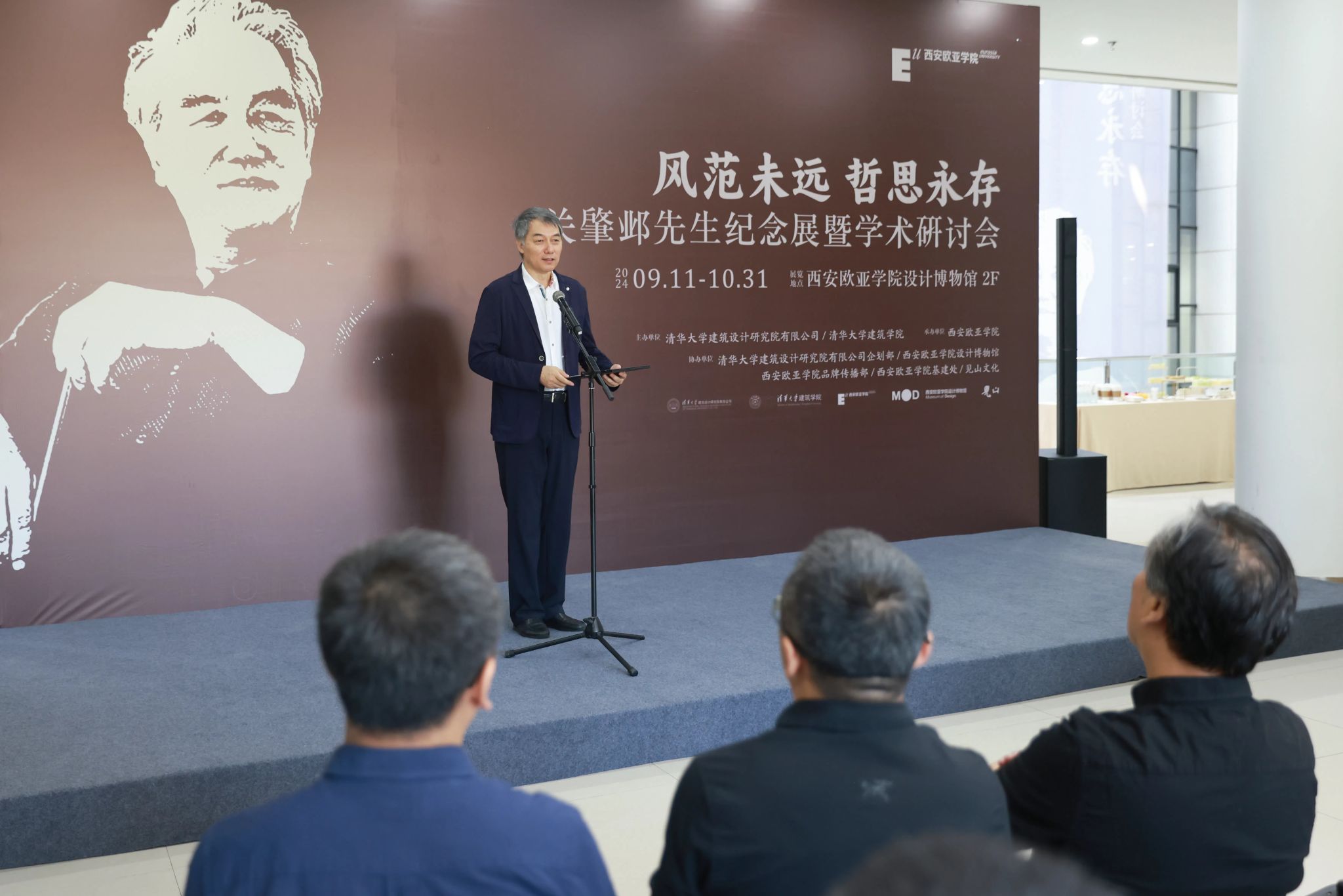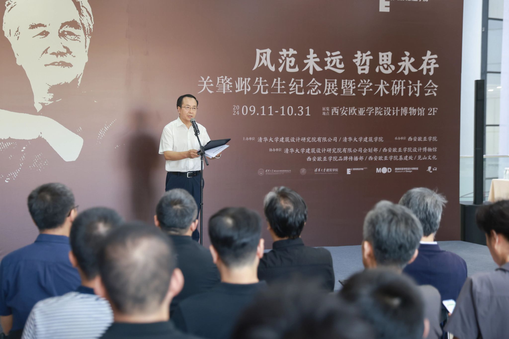 清华大学建筑设计研究院有限公司董事长、总建筑师刘玉龙在致辞时说:“关先生不仅是一位建筑师,一位建筑理论学家,他更是一位优秀的老师,关先生对待学生就像对待自己的孩子。昨天我来到欧亚已经晚上11点多了,我看见学校钟塔上的钟表还亮着,我就想到关先生就像指导我们的一盏明灯。校门口还特意放了两块牌子,一块是庆祝教师节,一块是关肇邺先生纪念展,我觉得这就是最好的纪念。”
