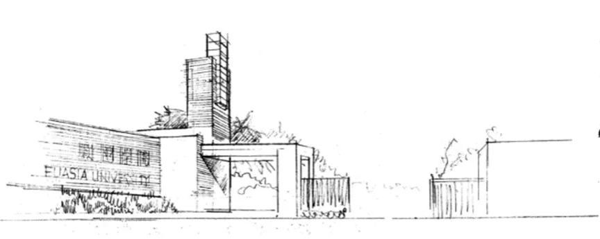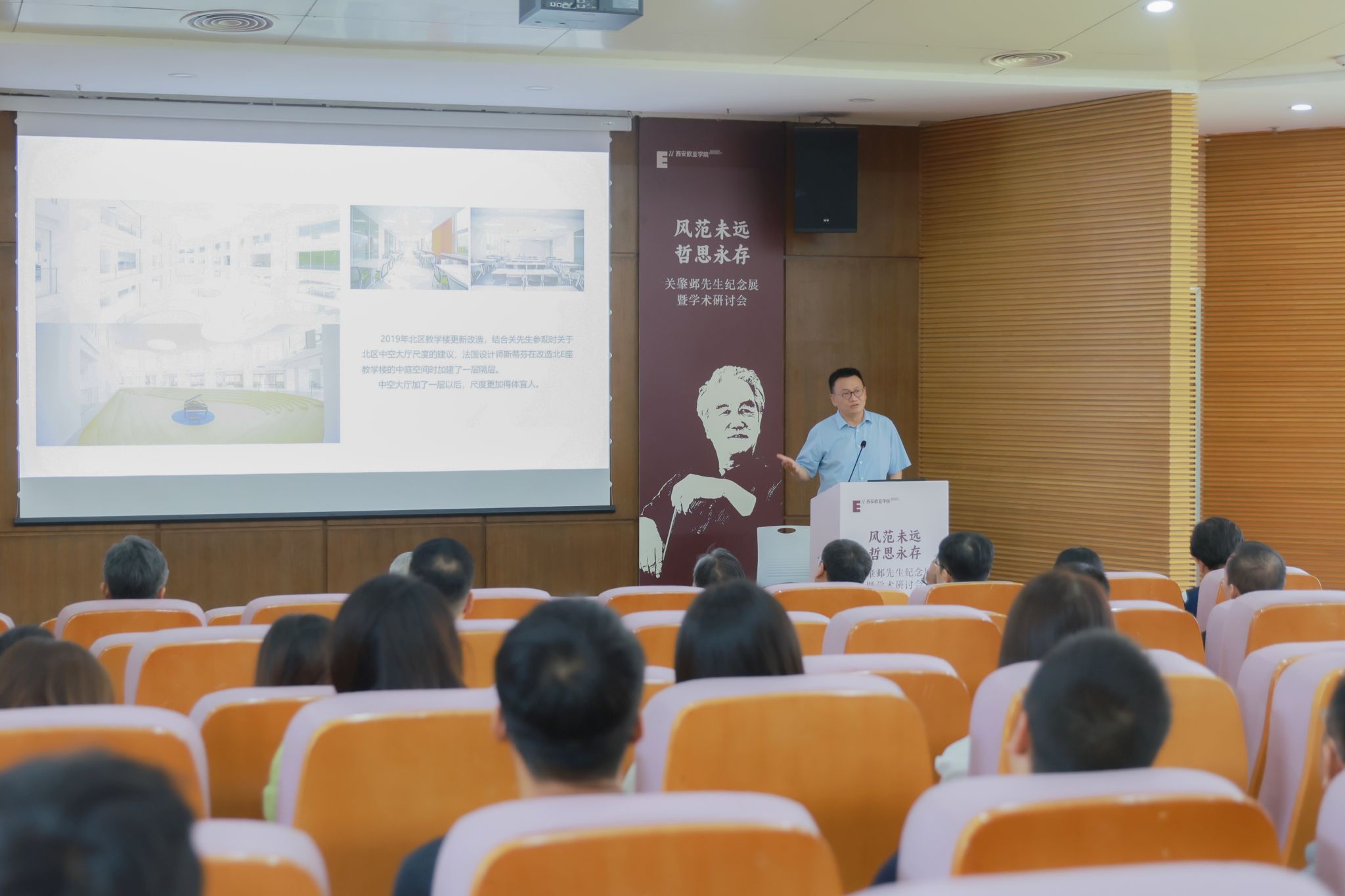 校园的蜕变是一所大学发展的缩影。胡建波以学校发展历程为切入,指出欧亚在步入规范发展期后,便立下两大愿景——建百年名校和为西安奉献人文景观。在此驱动下,他开始以高品质、高水准谋划校园建设,关肇邺先生和欧亚的故事亦徐徐展开:从2002年主持修建图书馆结缘,再到其走访校园时看到北区8号楼大厅(现为北A教学楼)、篮球场时发表的见解,再到设计大学生活动中心、学校东大门、南区教学楼、行政楼......10余年的时间,关肇邺先生不仅为欧亚建设出一批“和而不同”的教育建筑群,其“得体”的建筑哲思亦深刻影响着欧亚校园的建设。