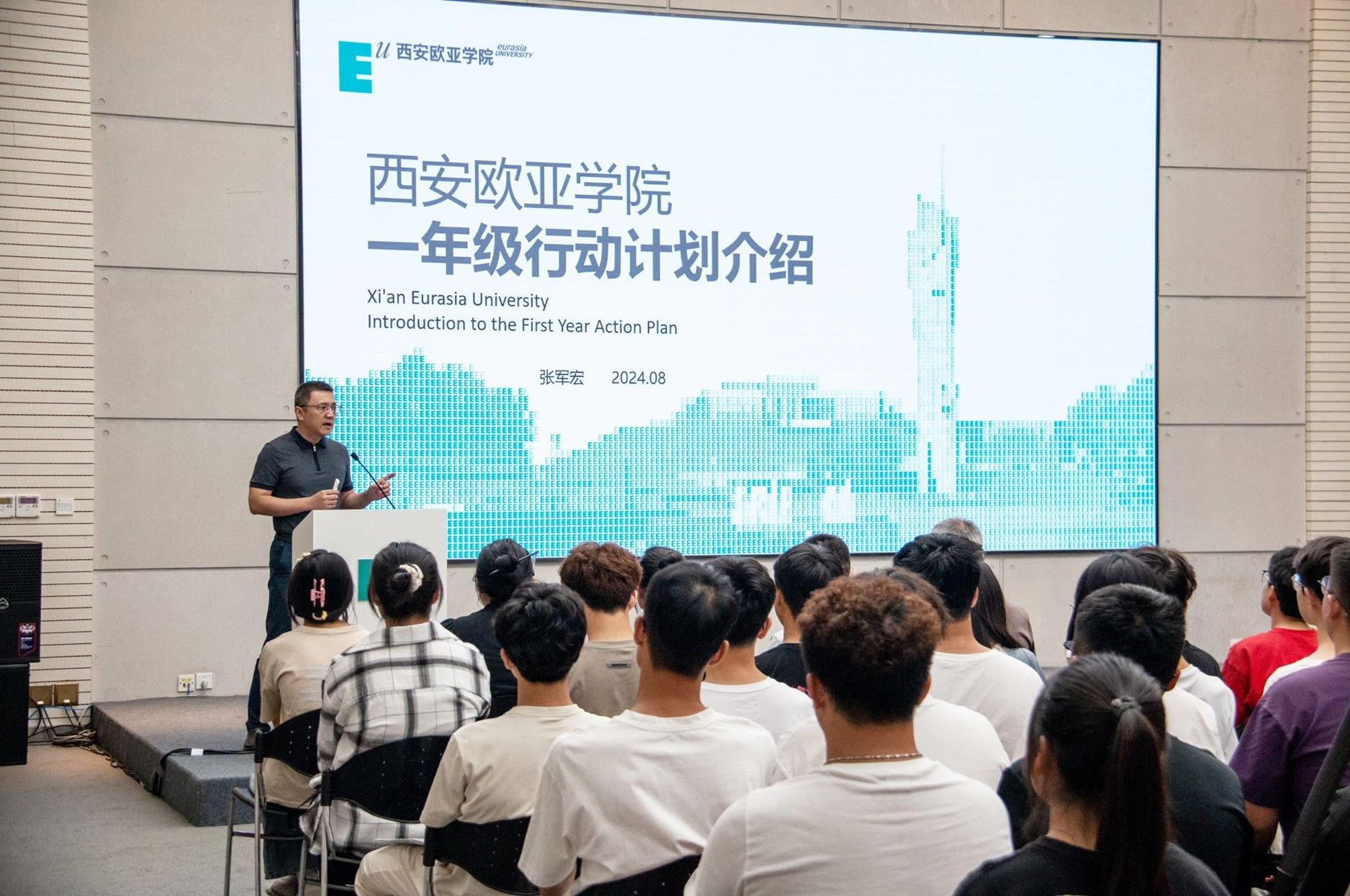 "Are you ready for the four-year life in Xi'an Eurasia University?" Later, Professor Sun Jianrong, Vice President of Xi'an Eurasia University, gave a lecture on the first class of the new semester for freshmen. With the theme of "What University Life Looks Like", he asked students three questions: "Higher education preparation beyond 4 years?" "AIGC-laden college experience?" and "Different yet more challenging job markets?"