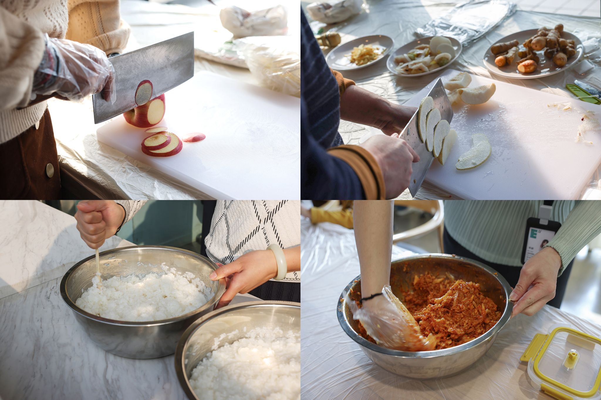 “大黑”他们用农产品连接起城市与乡村沟通的生活纽带,杨金——青年学习社区“鱼盐村”的创始人,则以食物为媒介,引导年轻人走进旷野,深刻反思自己与所生活的土地、自然和社会的关联。11月22日下午,杨金的“发酵的哲学”食作工坊,师生们通过学习腌制传统辣白菜,感受微生物在食材中的生长变化,体悟发酵的哲学。