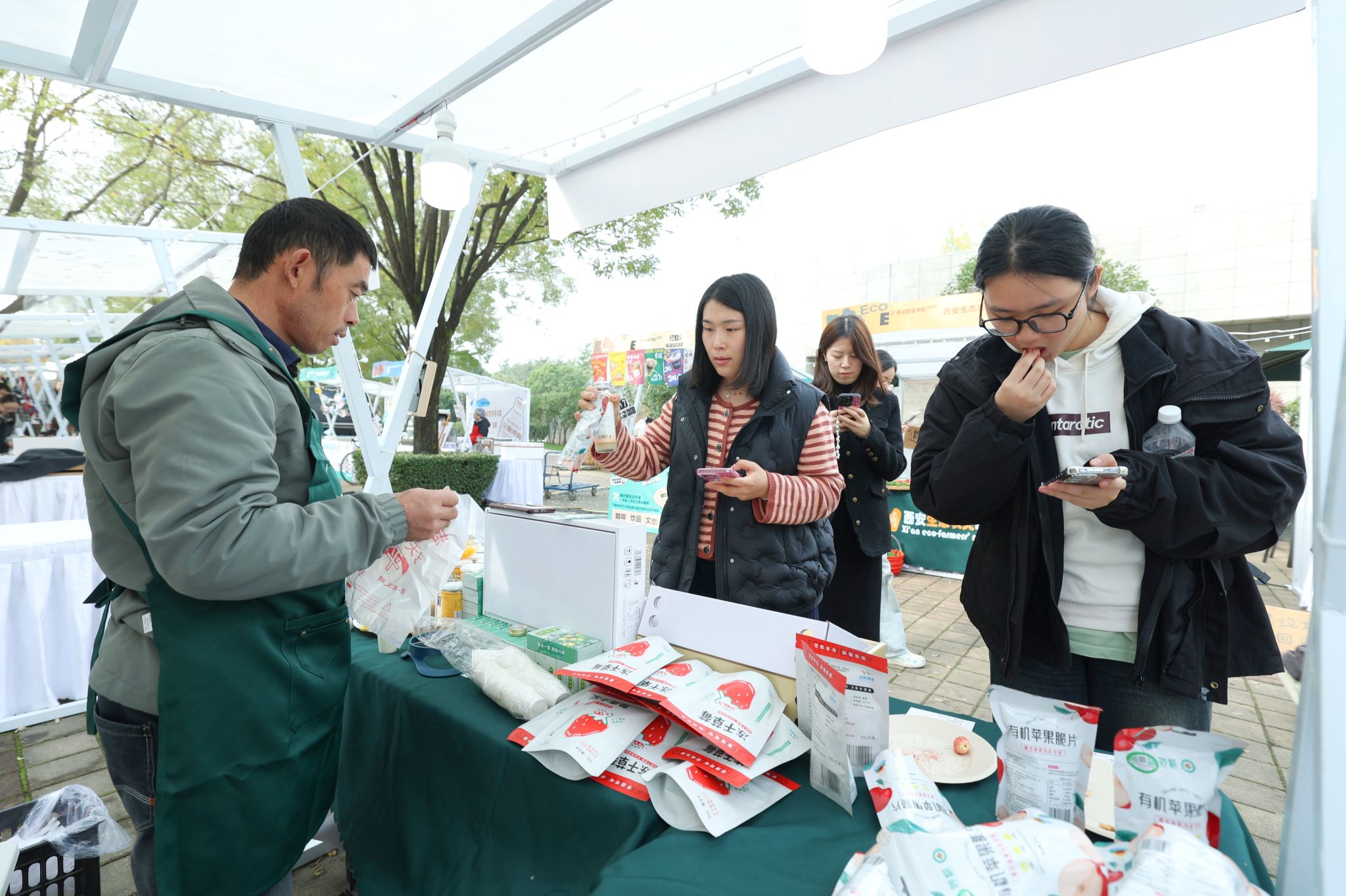 这次市集上,8家从事生态有机农业的农户和农场为校园带来了绿色的田园气息,新鲜、本地、有机是他们的主打关键词。小金黄老玉米制作的爆米花香甜脆口;使用传统方式种植、没有任何添加剂的猕猴桃风味浓郁酸甜;秦岭里古法养蜂采集的土蜂蜜味道纯正,“取一半留一半”的做法很好地保护了蜜源和秦岭原有生态;你还可以坐下来和农夫们喝喝茶,尝尝各种有机饼干、酥饼,聊聊他们眼中食物与自然的关系……