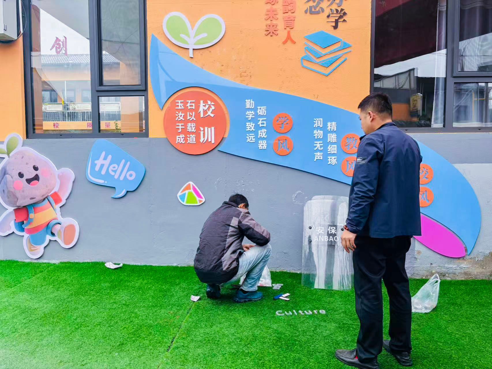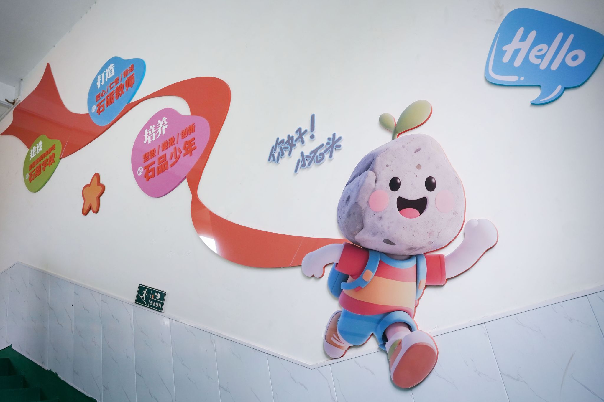 8月初,由艾德艺术设计学院耿暖暖、陈斐、刘玥頔、刘晨四位教师组成的专家组赴牛家湾小学进行实地踏勘与精准测量。之后,由耿暖暖、张伟及大四实习学生团队共同完成了融合“石文化”理念的校园环境设计与改造方案。9月,改造工程全面落地,校园教学楼外立面及楼道空间焕然一新,实现了从物理空间到文化育人阵地的深刻转变。