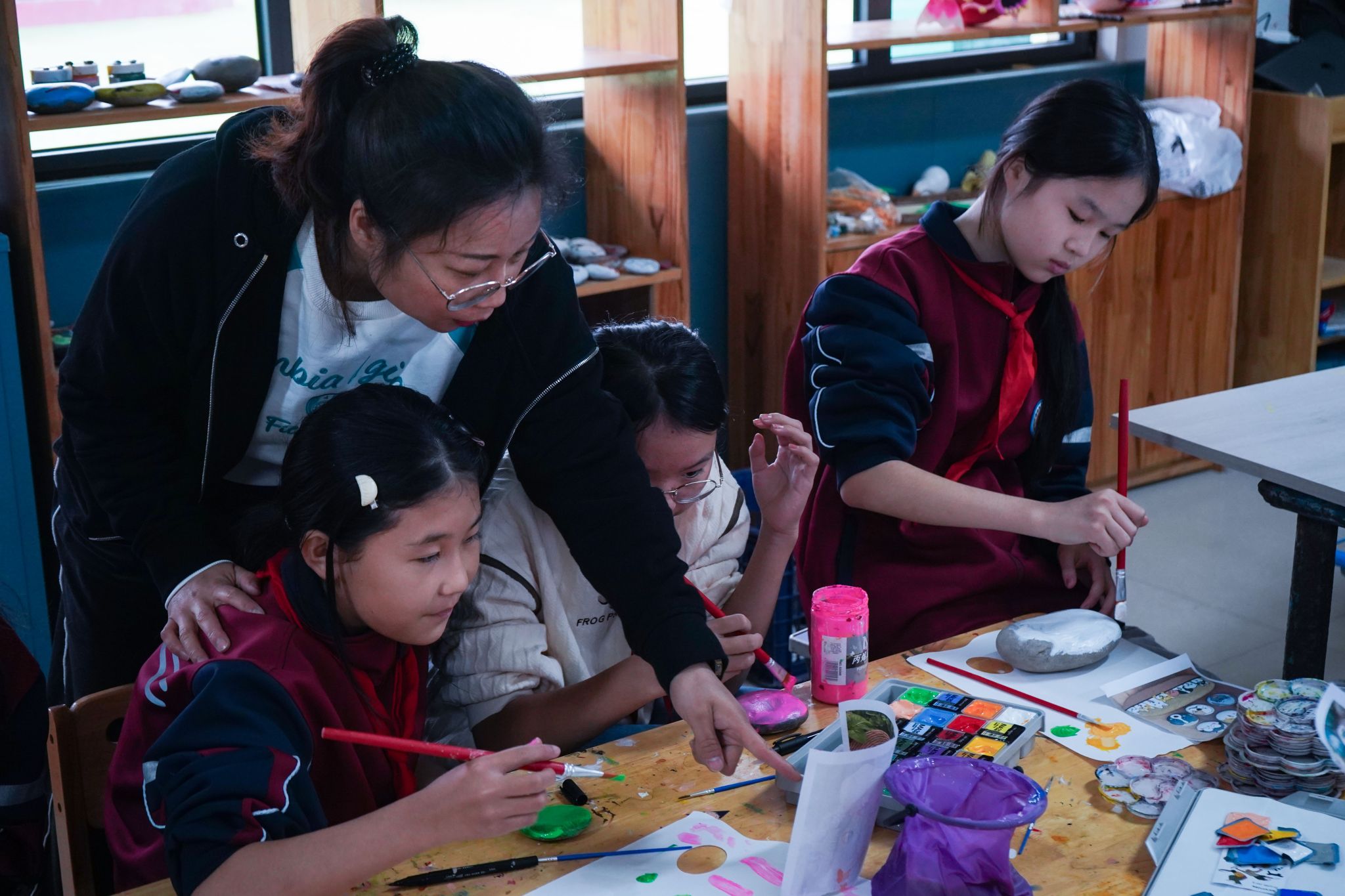 9月22日,在牛家湾小学教育环境设计与改造项目完满竣工之际,项目师生团队为孩子们准备了美术文具礼物,公益艺术课“石头上的艺术魔法”也随即开展。该课程由耿暖暖、徐娜及行业教师张伟共同指导,参与环境设计与改造项目的实习学生辅助教学,将校园环境中的“石文化”主题延伸至动态课堂,有效激发了学生的艺术兴趣与创造力,实现了美育对童心的深层浸润。