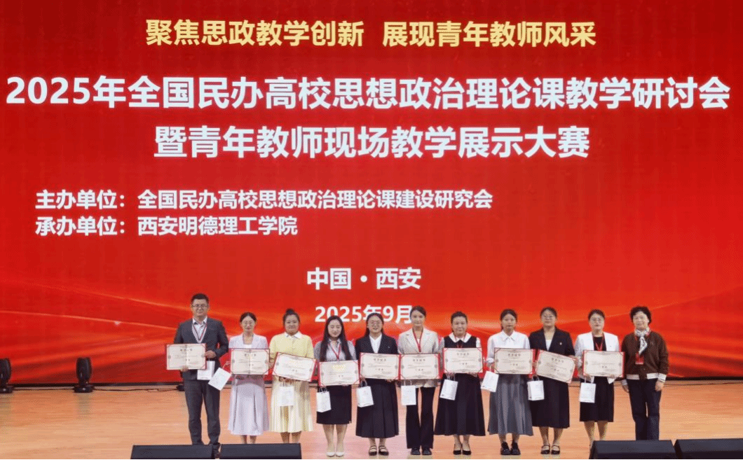 2025年9月21日,由全国民办高校思想政治理论课建设研究会主办的全国民办高校思想政治理论课教学研讨会暨青年教师教学展示大赛在西安隆重举行,beat365手机版官网马克思主义学院的刘应清老师凭借深厚的理论功底、创新的教学设计和生动的课堂表现,从众多参赛选手中脱颖而出,荣获一等奖。