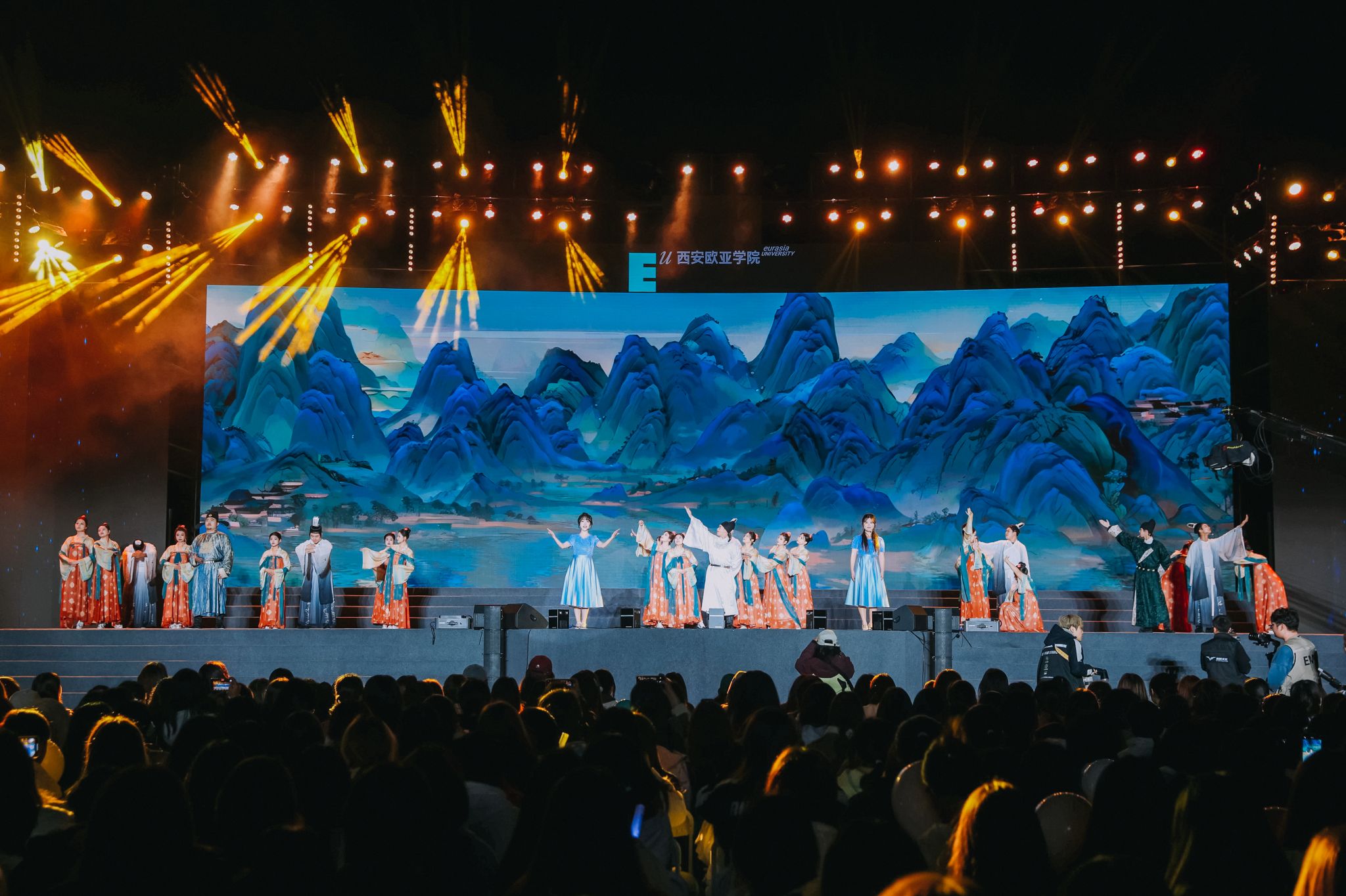 随后,胡建波和副校长李正、吉他社的同学一起,演唱了影响一代人的摇滚金曲《蓝莲花》,用音乐致敬30年的青春。歌声响起,灯光星海闪烁。那一刻,音乐不再只是旋律,而是一种力量——来自欧亚的信念与精神。歌声穿越时间,连接了30年的追梦者,也照亮了此刻的青年面庞。