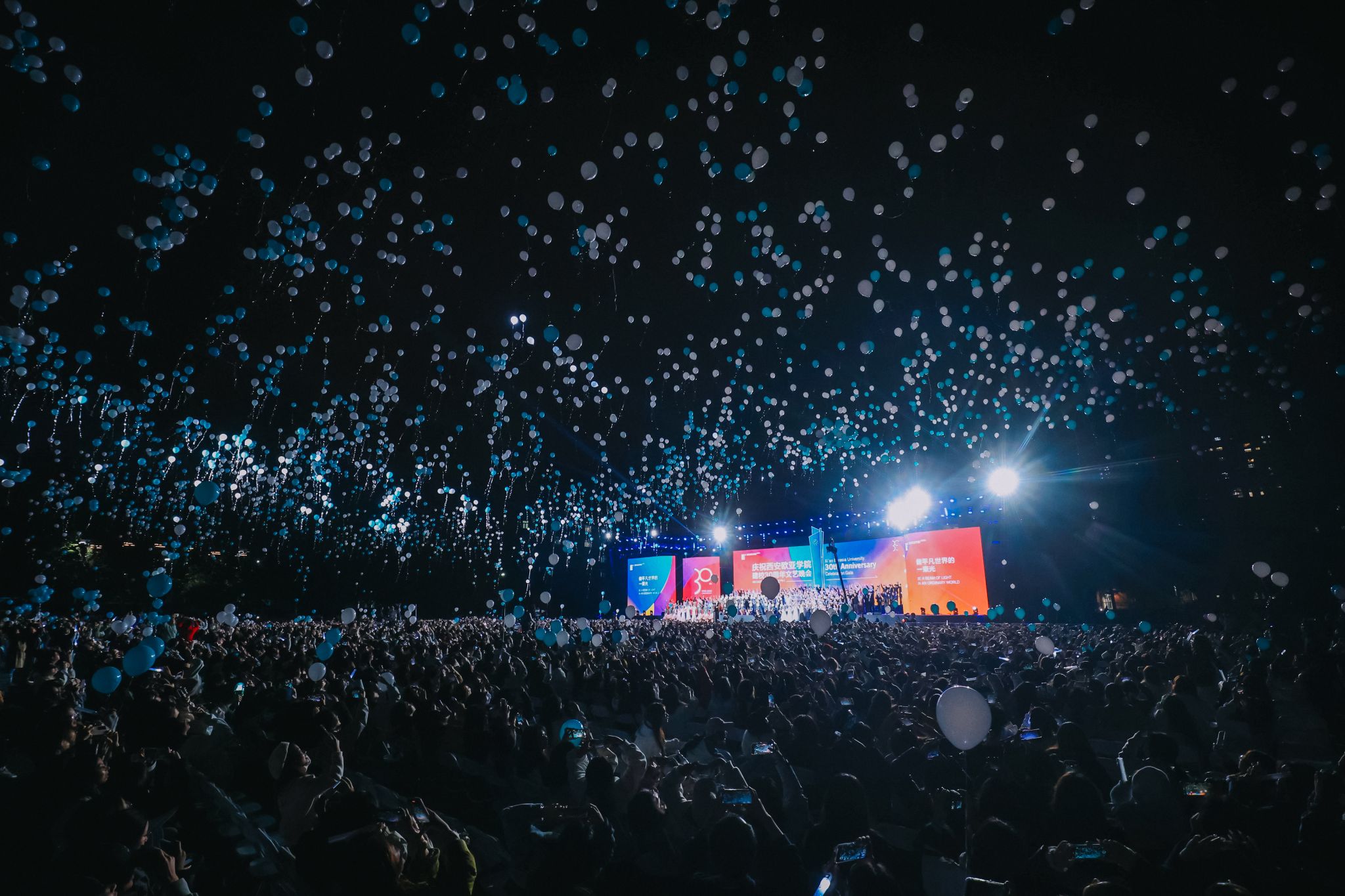《我爱你中国》的旋律响起,每个人手里的绿白色气球交织放飞,飘向更高的天空,在下一个30年的旅程里,我们与你一起,循着平凡世界的光亮,继续述说欧亚故事和教育理想。