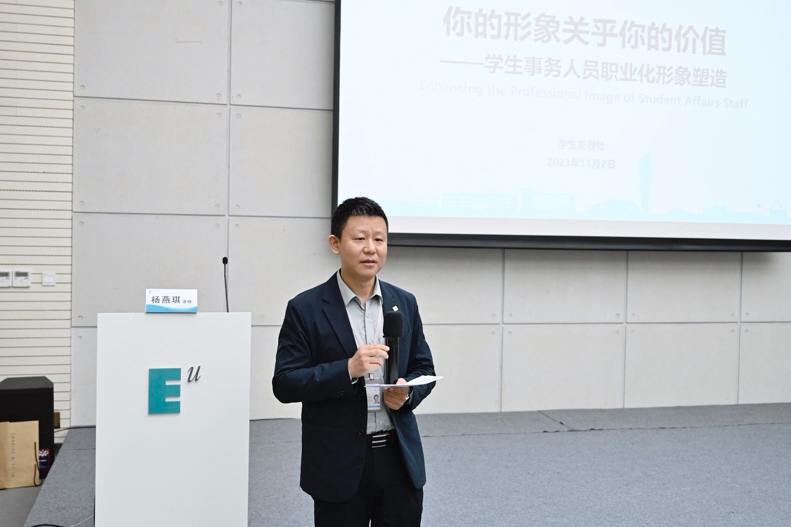 学生发展处处长董杨作开场致辞。在讲话中,董老师强调,在青年社区共享价值观“整洁、健康、友善、自律”中,排在第一位的首先是“整洁”,得体的穿着打扮和仪容仪表将影响他人对你的第一印象。对于学生事务人员而言,职业形象反映了个人的职业态度和专业素质,保持良好的仪容仪表,才能呈现学生事务人员专业和可信赖的形象。希望各位老师可以通过本次学习,提升职业形象塑造能力,通过不断提升职业技能,在工作中展现出自己的能力和价值。
