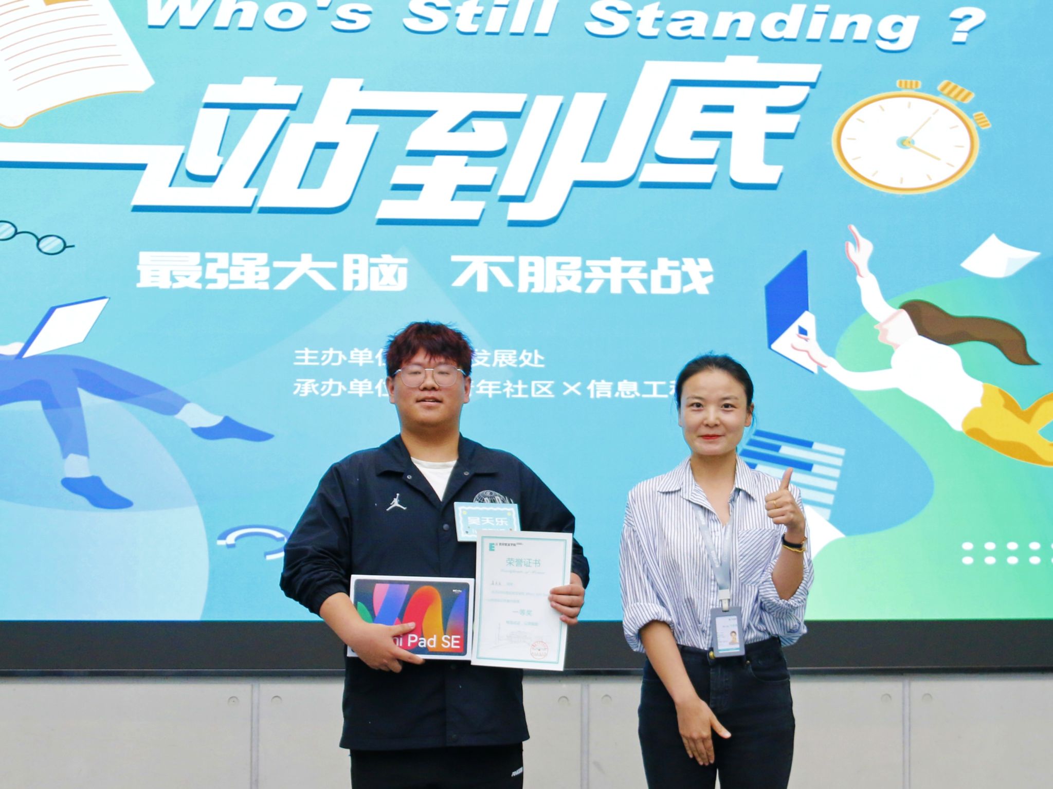 为拓宽学生知识面,激发学习兴趣,培养思维模式,促进学生沟通表达能力和应变能力的提升,由学生发展处主办、Ivy青年社区与信息工程学院承办、大学生科技协会(社团)协办的“Who's Still Standing一站到底”知识竞赛决赛于5月16日在大学生活动中心16号房成功举办,来自全校共103名师生参与本次活动。