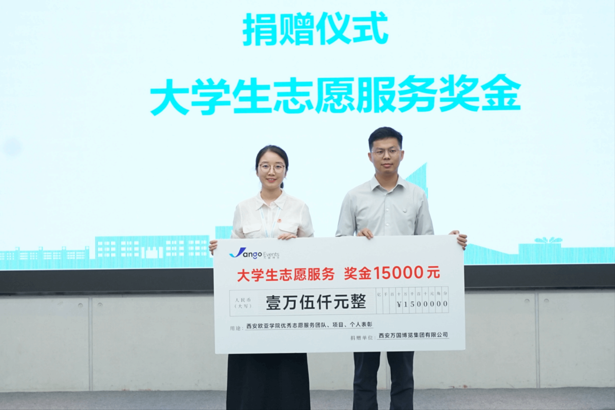为了支持学校志愿服务工作的发展,西安万国博览集团有限公司高级项目经理田秀鹏代表公司向beat365大学生志愿服务工作捐赠奖学金15000元整。beat365团委副书记李艳代表学校接受捐赠。之后这笔奖金将用于学校优秀志愿服务团队、项目及个人的表彰奖励。