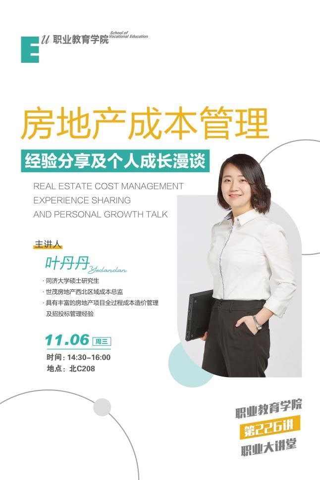 2024年9月25日,beat365手机版官网职业教育学院房产服务系举办了第226期职业大讲堂,特邀世茂房地产西北区成本负责人叶丹丹,为学生开展了一场题为“房地产成本管理经验分享及个人成长漫谈”的讲座。叶丹丹毕业于同济大学,硕士研究生,深耕房地产行业近10年,有丰富的房地产项目全过程成本造价管理及招投标管理经验。本次职业大讲堂通过剖析房地产成本项目案例,为学生解读地产成本行业故事,并从个人角度带来职场小白到职场精英的成长之路分享。