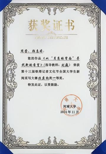11月1日,职业教育学院数字创意系新闻学(专升本)2023级学生周莹、颜惠婷在教师刘巍的指导下,撰写的作品《从“月亮的背面”寻找新的希望》,击败众多重点公办大学学生,在1081件参赛作品中脱颖而出,获得“第十三届铁塔记者文化节全国大学生新闻采写大赛”非虚构一等奖。
