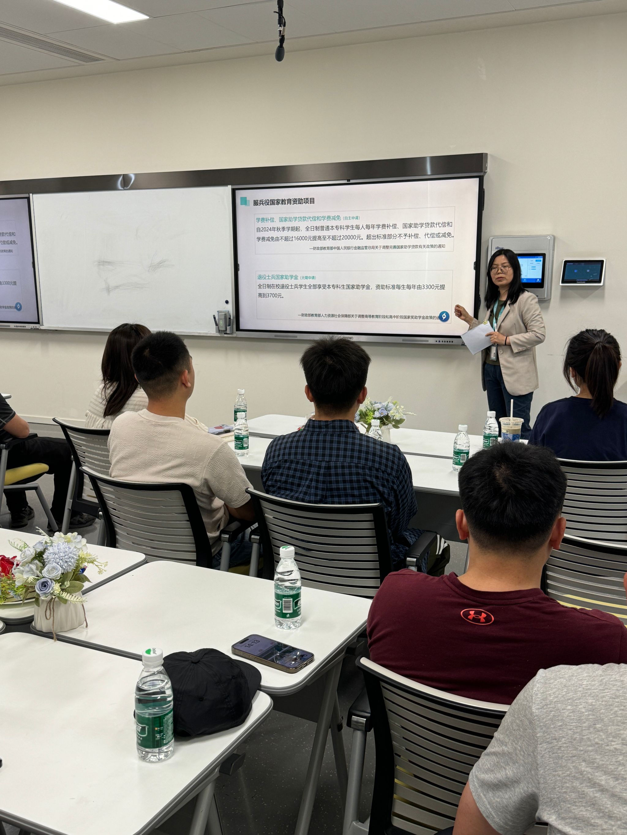 座谈会上,学生发展处一站式服务中心的郭晓惠老师重点解读了服兵役国家教育资助的学费补偿、助学贷款代偿、学费减免和退役士兵国家助学金二类资助政策和申办流程,让同学们对资助政策有了更加清晰的认知,也感受到国家对他们完成学业的支持。