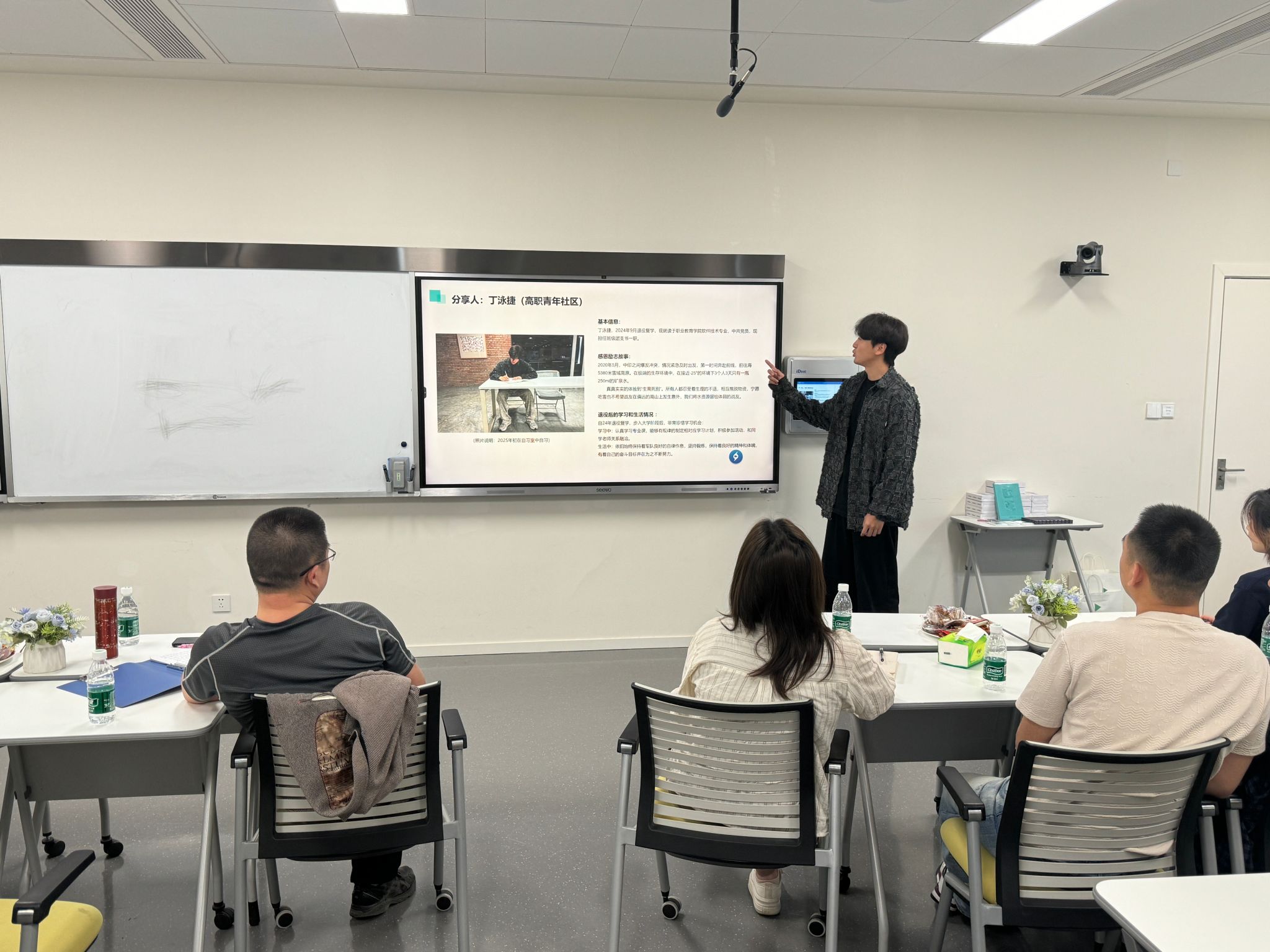 学生分享环节,退役士兵们敞开心扉,分享他们的军旅生涯。时而感恩励志,时而幽默风趣,他们的故事里,有汗水、有泪水、有热血、有成长,将军旅生活的酸甜苦辣毫无保留地呈现出来,这种经历将在今后的学涯中激励他们克服一个又一个困难!