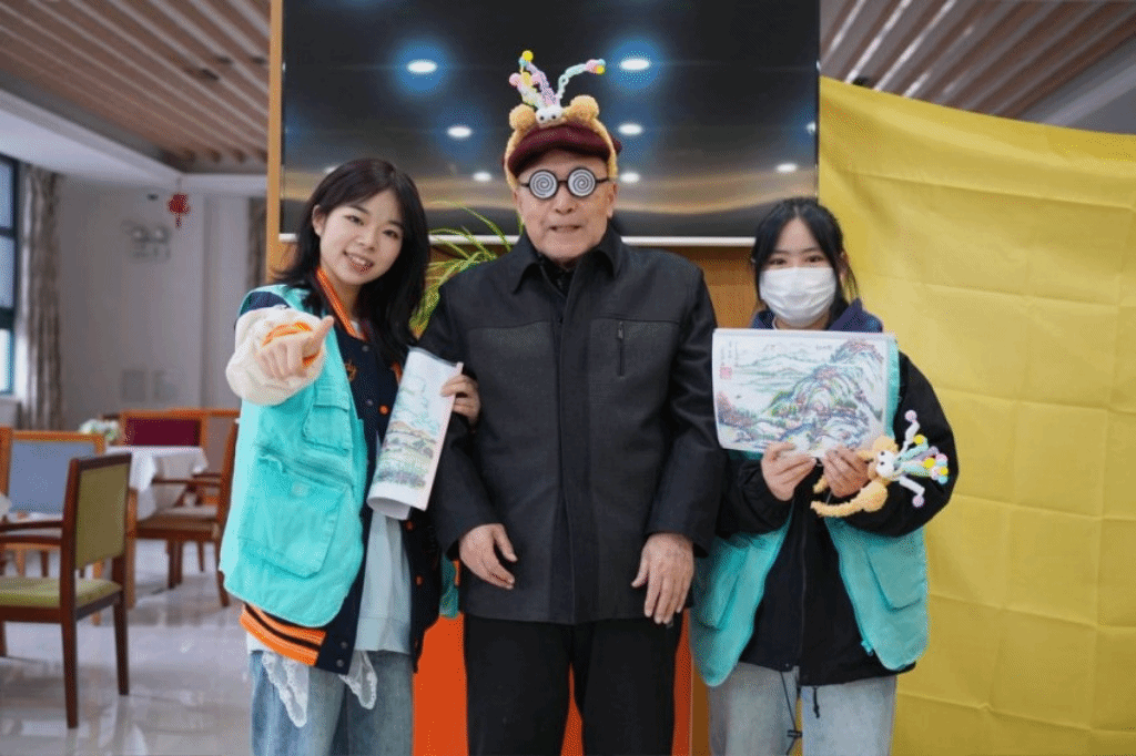 梁同学参加基层团委组织的关爱敬老院活动(右一)