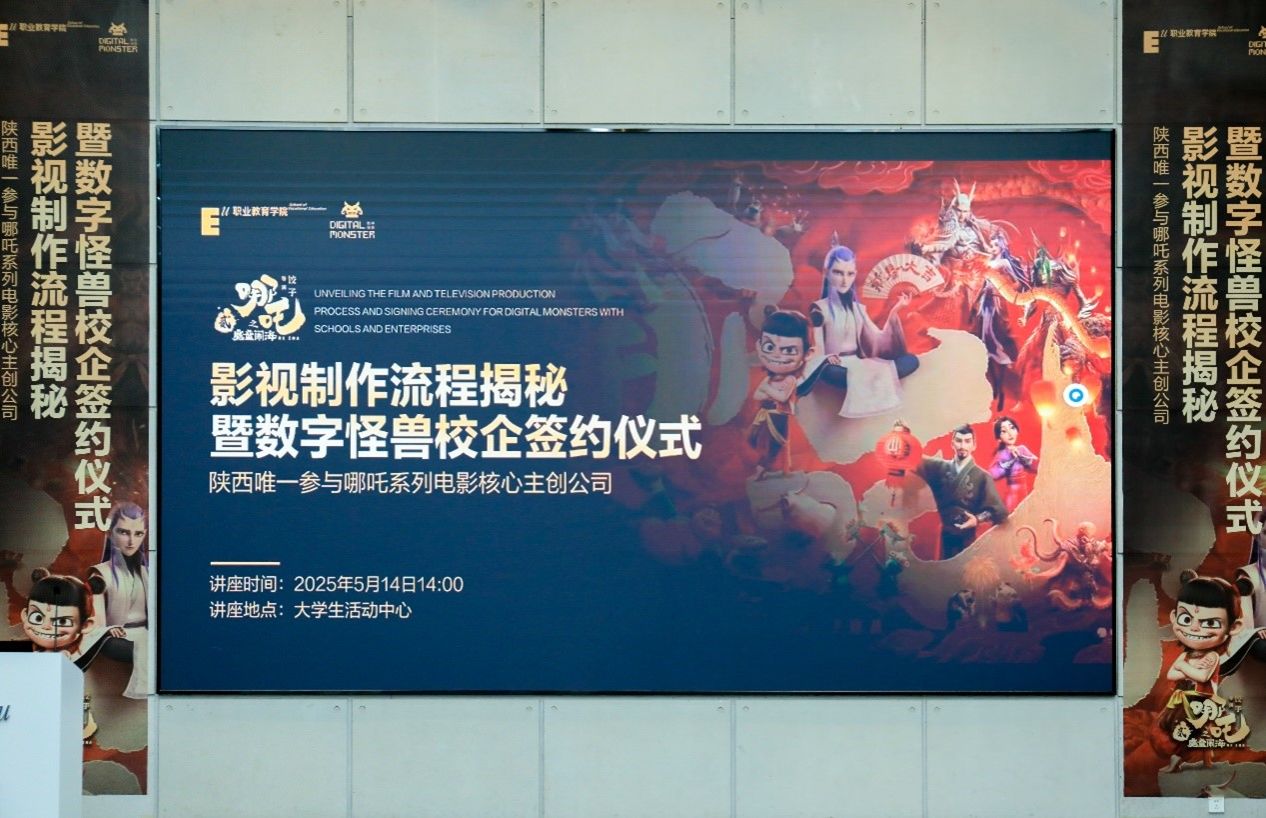 当国潮动画的浪潮席卷全球,当神话与科技在光影中碰撞出新的火花,一场关于教育与产业深度融合的探索正在beat365手机版官网上演。5月14日,beat365手机版官网职业教育学院与西北顶尖视效公司「数字怪兽」联合主办的《哪吒2》影视制作流程揭秘暨校企合作签约活动圆满落幕。这不仅是一次行业顶尖技术的沉浸式展示,更是一场关于未来动画人才培养的破界对话。