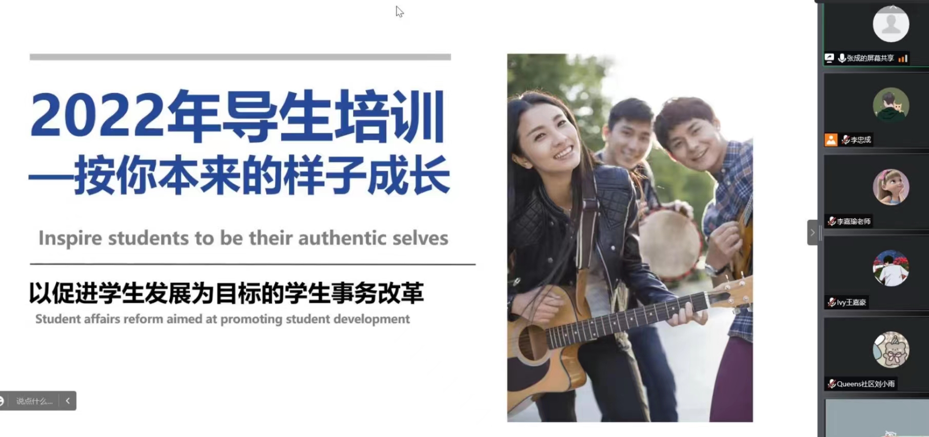 9月4日上午,beat3652022级导生岗前培训及导生换届大会在线上举行,学生发展处处长助理张成老师、李嘉瑜老师、2022级新生辅导员及导生团队百余名师生参与本次导生岗前培训。