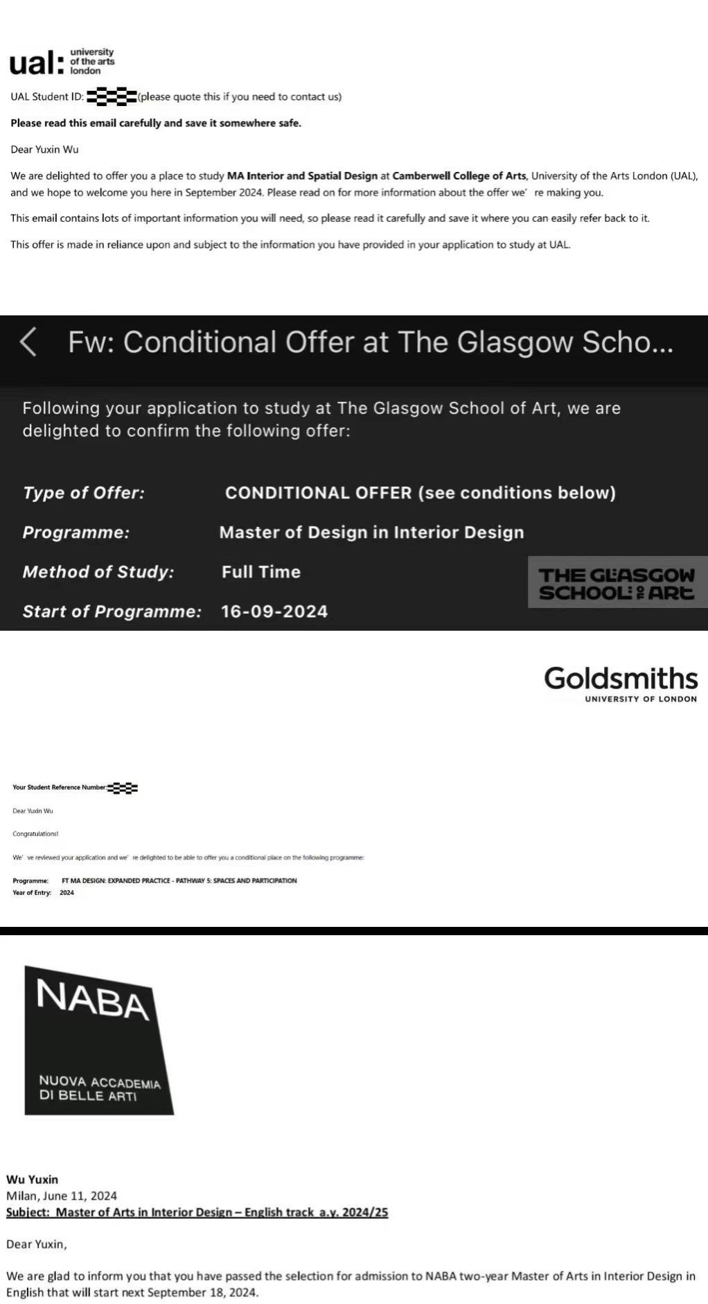 吴雨欣收到格拉斯哥艺术学院硕士录取通知
