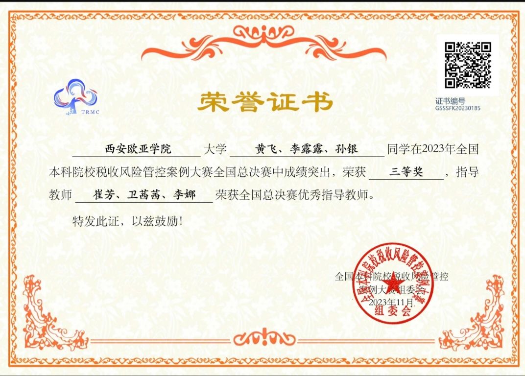 大三上学期,黄飞和李露露、孙银两位同学组队,参加了2023年全国本科院校税收风险管控案例大赛,并以省赛一等奖的成绩晋级全国总决赛。竞赛内容为选取某一上市公司,通过市场调研和公司财务年报分析,结合相关政策法规及税收理论,为企业提出有效的风险防控方案和问题解决对策建议。在崔芳和董瑜伦老师的指导下,他们前后修改了20多稿案例汇报方案。2023年11月25日,在杭州的决赛现场,黄飞和团队成员对案例的税务风险筛查依据、税务风险结果及税务处理方式等内容一一作了汇报,最终他们收获三等奖,还收到了大赛组委会发出的就业推荐信和面试入职通知书。这意味着他们有机会在毕业时得到浙江省税务师行业用人单位的优先实习和录用机会。