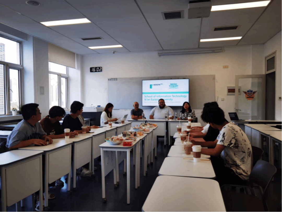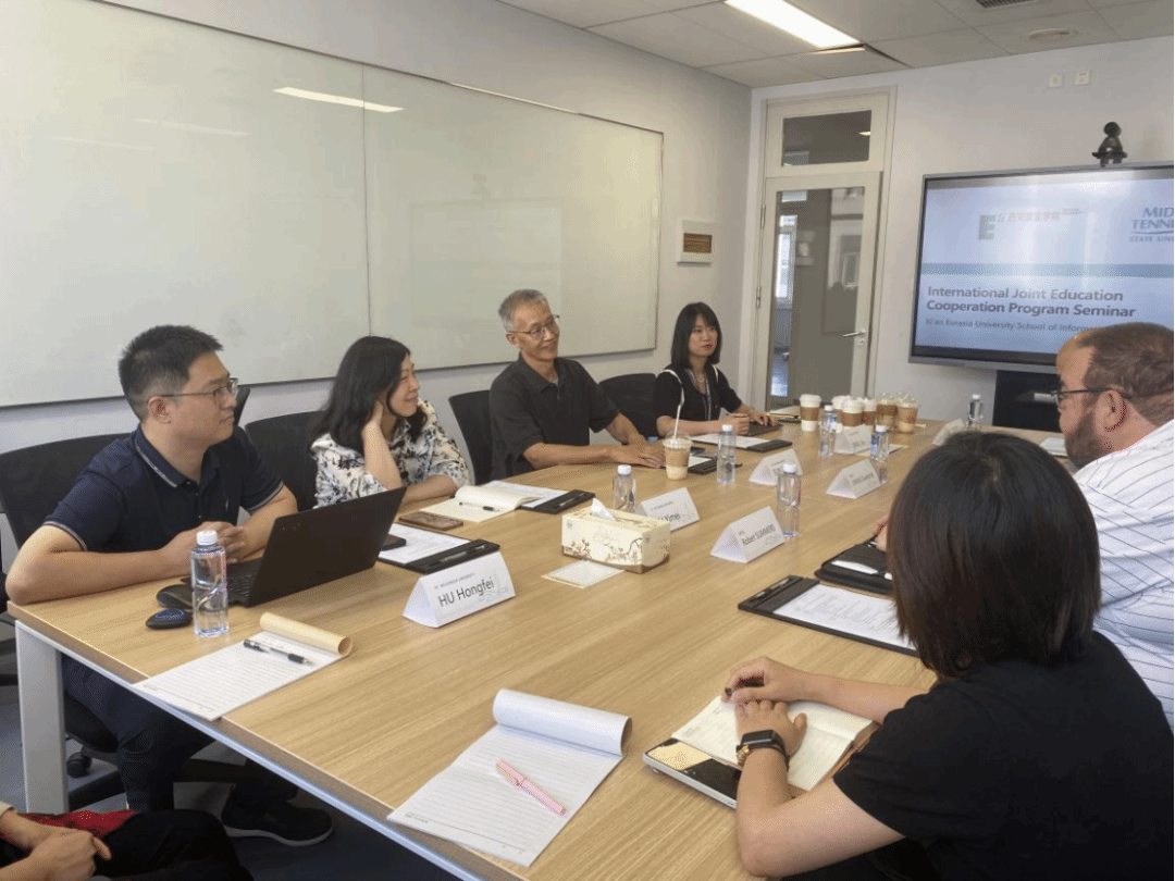 7月4日下午,西安欧亚信息工程学院与美国中田纳西州立大学合作的中外合作办学项目专业课程研讨会在信工学院4楼顺利举行。出席本次活动的嘉宾包括:beat365手机版官网副校长孙建荣教授,美国中田纳西州立大学副校长Robert Summers,亚洲学习中心主任Guanping Zheng,国际合作与交流中心主任丁洁老师,以及中美合作办学项目组徐以美老师和胡红飞老师。