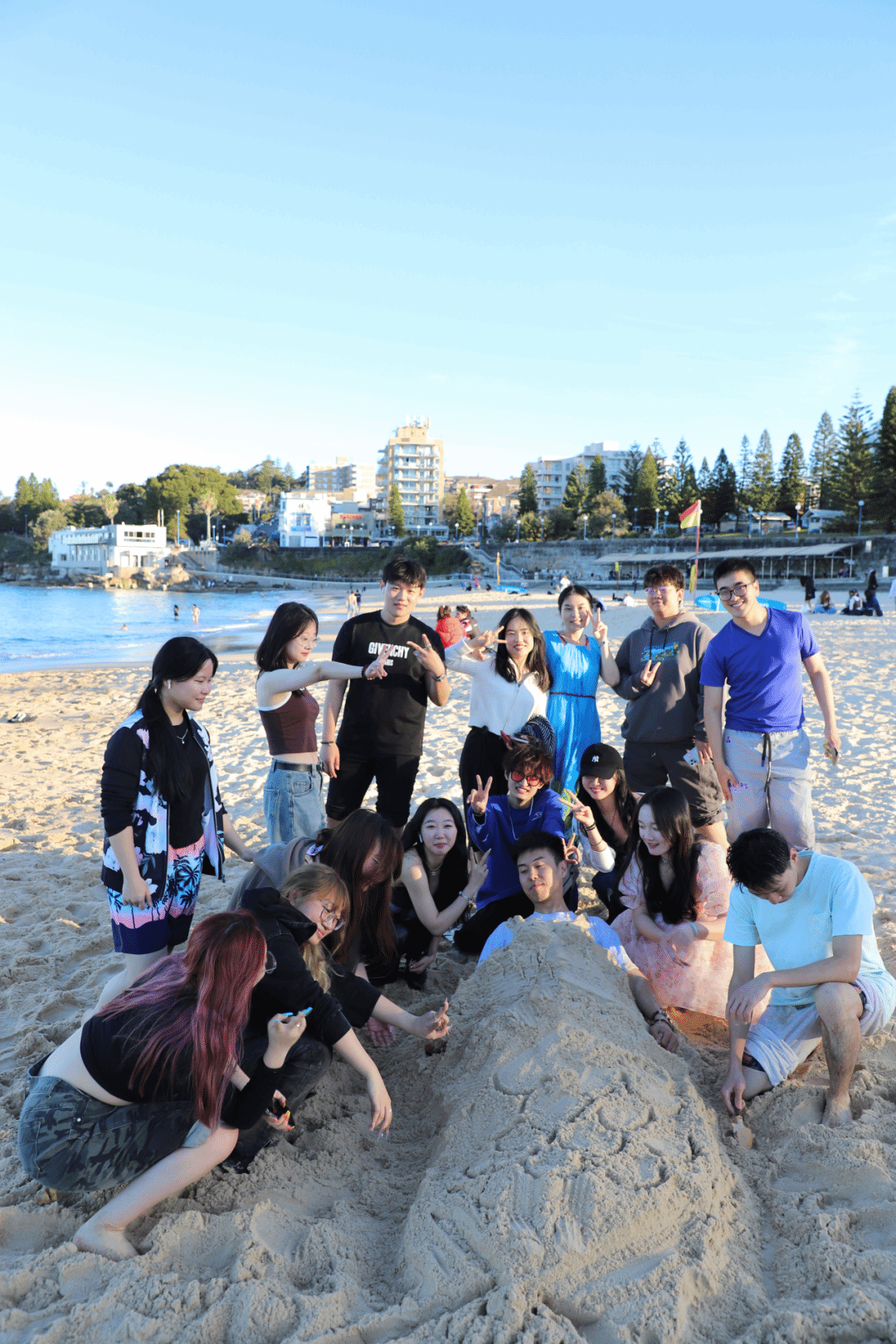 同学们在海滩上堆沙堡,踏着海浪,大家在欢声笑语中享受美好的海滩时光。