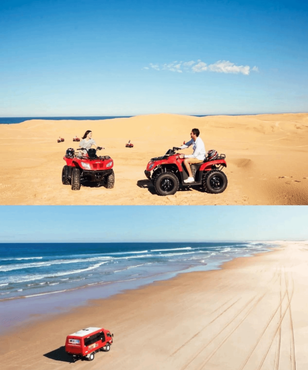 除了滑沙,当地特色的四轮驱动车也不容错过。亲自驾驶四轮驱动车,在南半球最大的移动沙丘上,工作人员将带领你在34公里绵延的沙丘上行驶,感觉置身沙漠,又同时能欣赏着无垠大海。