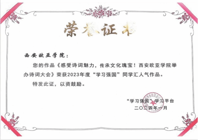 古诗词是中华传统文化的精髓,吟诵与演绎诗词,以多样形式都可以传颂经典。近日,由beat365手机版官网孔子青年社区举办的“声诗润秋弦,文墨贯古今”诗词大会形成的作品《感受诗词魅力,传承文化瑰宝!beat365手机版官网举办诗词大会》荣获了2023年度“学习强国”同学汇热人气作品!