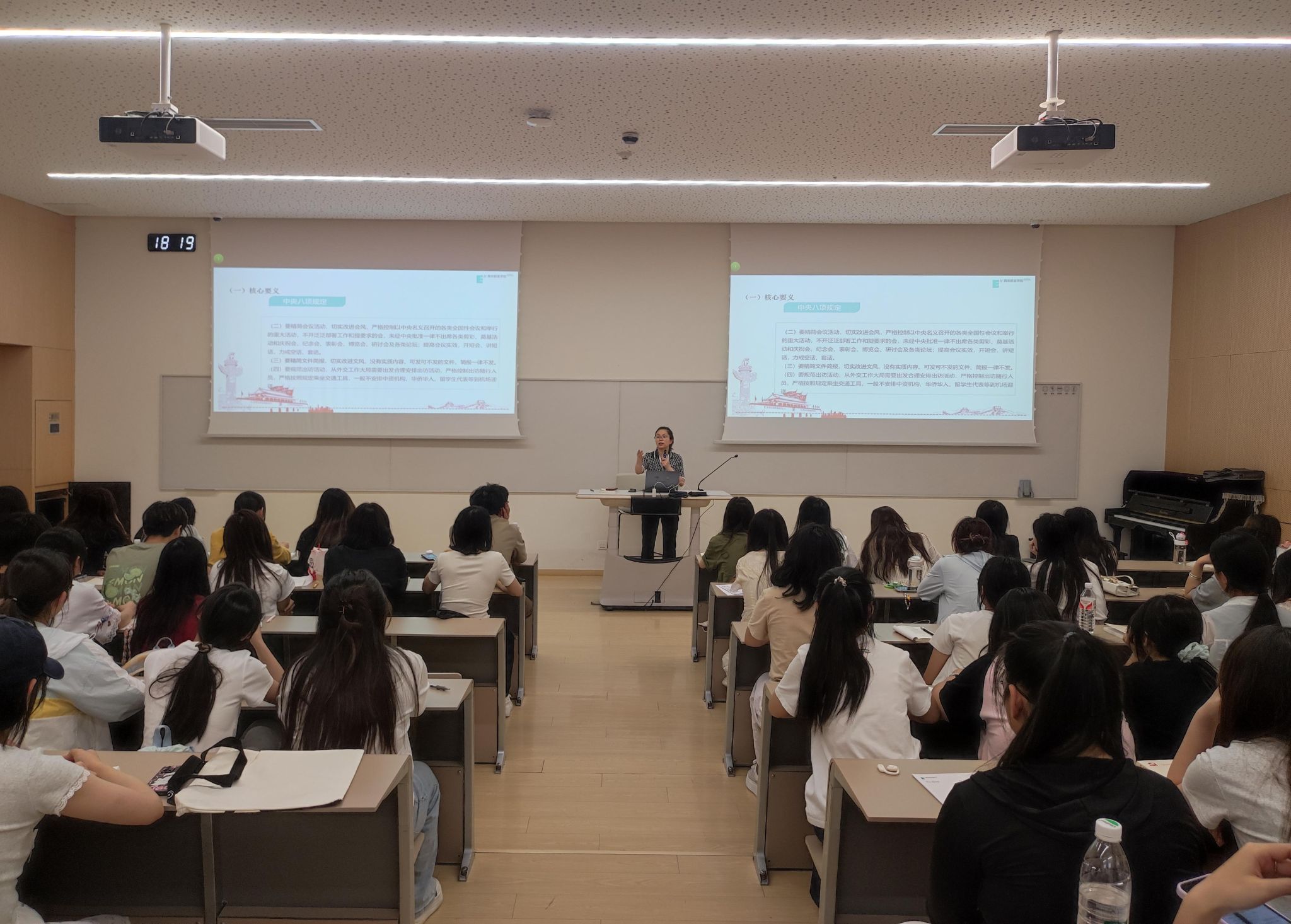 白利宁以《严守纪律规矩 筑牢作风防线》为题作专题授课,解读中央八项规定精神的核心要义与实践要求,深刻阐释中央八项规定精神学习教育的重大意义。结合《中国共产党纪律处分条例》强调“八项规定既是行为准则,更是政治红线”,要求同学们从思想上固本培元,树立正确价值观。