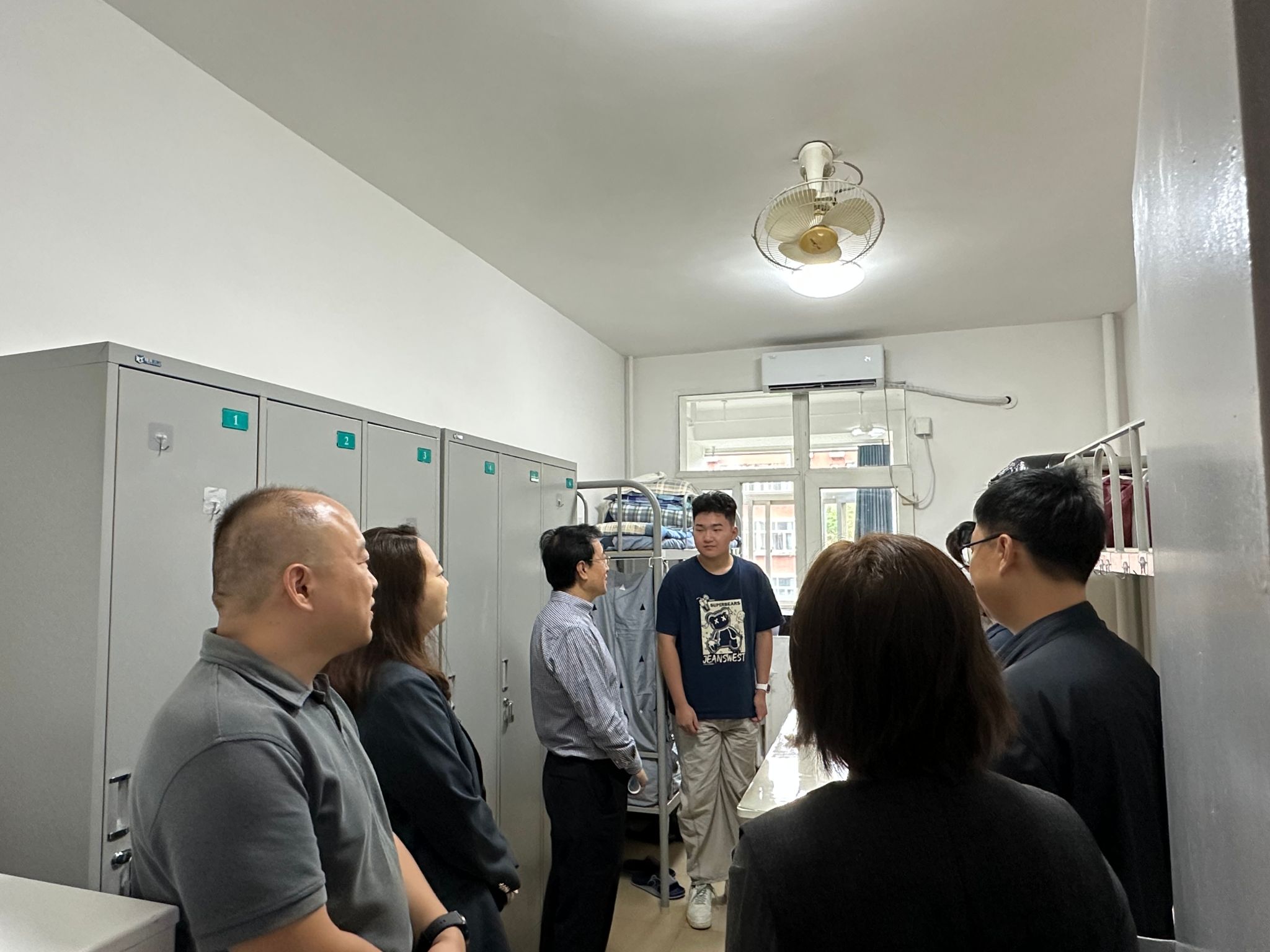 走访过程中,赵国华书记一行与同学们亲切交流,详细询问住宿环境、饮食情况及入学适应状态。并仔细查看宿舍设施,向学生们强调要规范使用电器设备,注意宿舍用电、用水安全,防范潜在风险。赵国华书记关心学生日常生活是否便利,并叮嘱大家互相关心、互相帮助,共同营造整洁、健康、友善、自律的宿舍环境。若在生活或学习上遇到问题,及时向辅导员和学校反映,学校将全力解决后顾之忧。面对校领导的关心,新生们纷纷敞开心扉,分享入学以来的新鲜体验,言语间满是对大学生活的期待与憧憬。家长们也表示对学校及宿舍的环境设施的肯定,希望学生可以在这里学习知识、拓展综合素质,在校园中找准方向,成长为有理想、有本领、有担当的新时代青年。